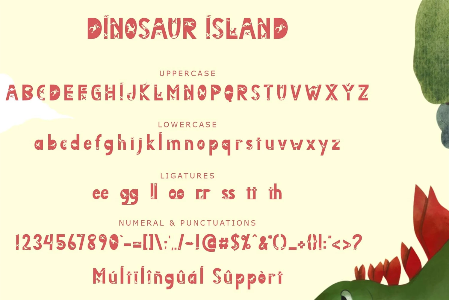 "Dinosaur Island" is a cute display font with dino decorations on each letter. Equipped with uppercase letters, lowercase letters, ligatures, numerals, punctuations and multilingual support. Very suitable for comics, film titles, book titles, birthday greetings, logos, banners, branding and others.