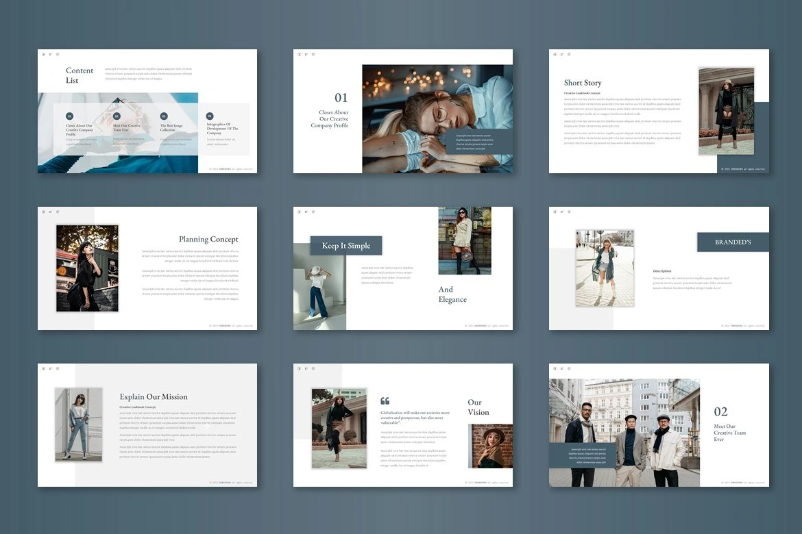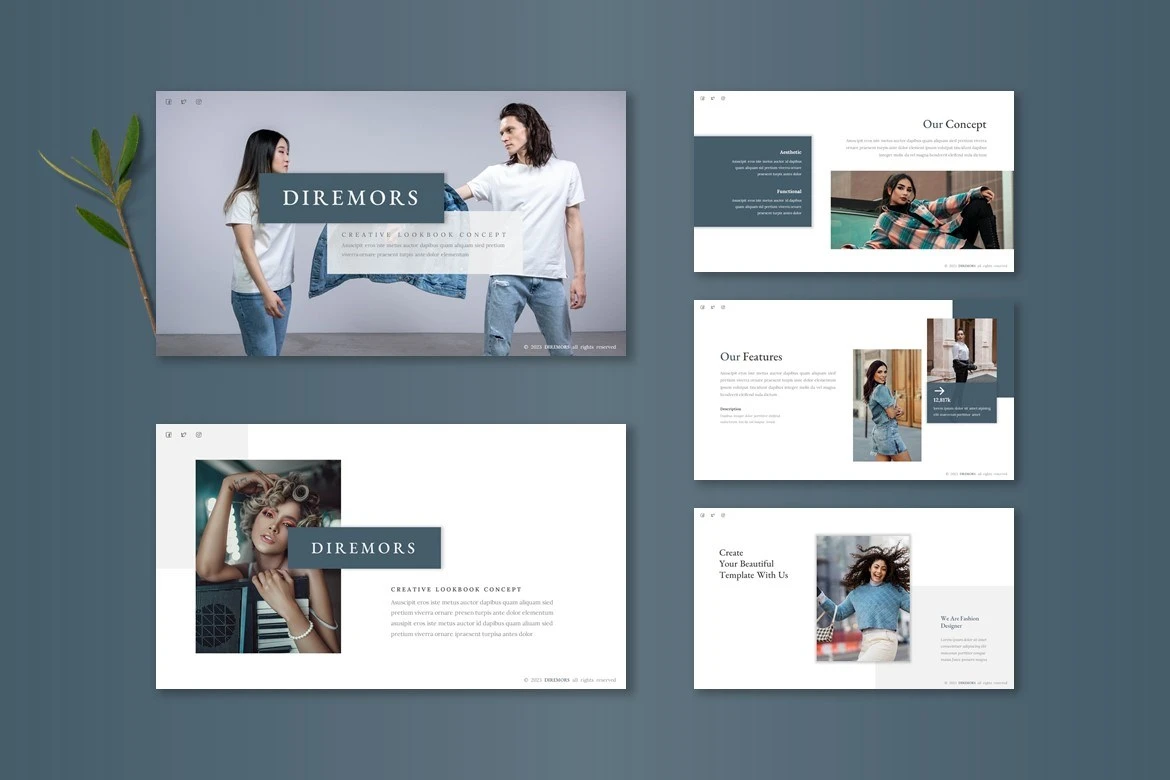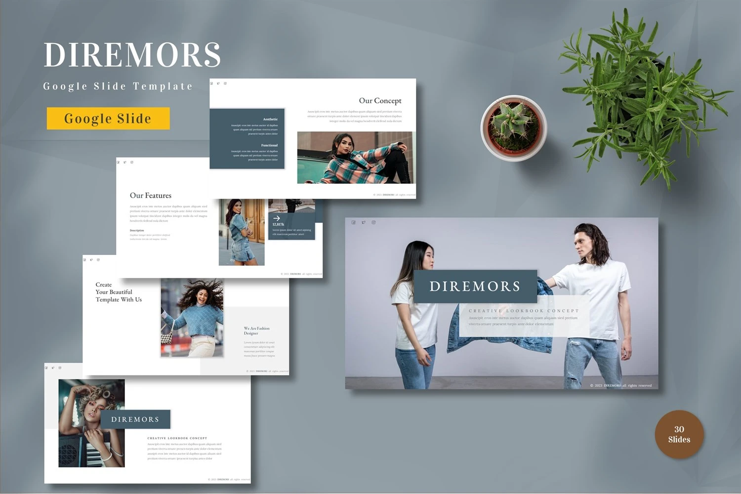 Get it now! **Diremors - Google Slide Template** for All Business and Personal Needs All elements on this template are editable; input your content, replace your image with a placeholder, change the color, and all presentations include an animated slide to present your slides.