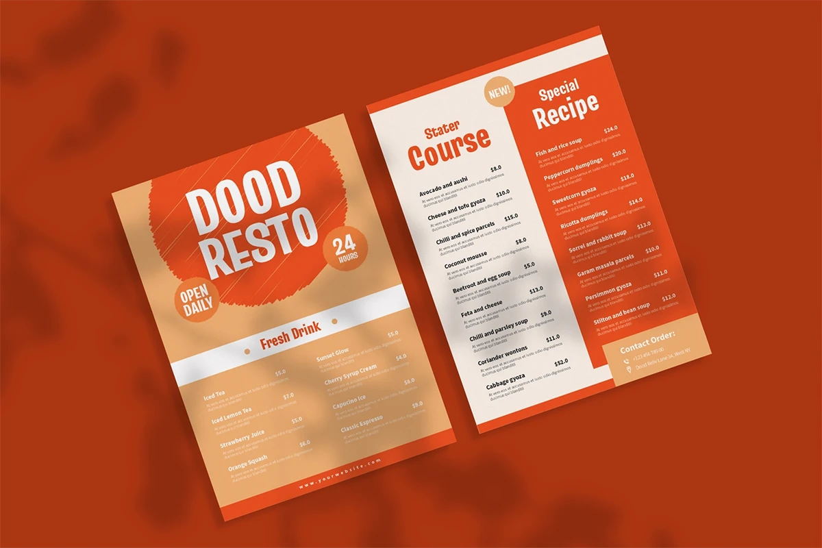 Dood Resto - Restaurant Menu. This template is great for your business and will make your customers interested, elegant, and easily editable according to your needs, this restaurant menu is perfect for, promos, cafes, hotels, resort shops online. etc. I hope you enjoy this restaurant menu