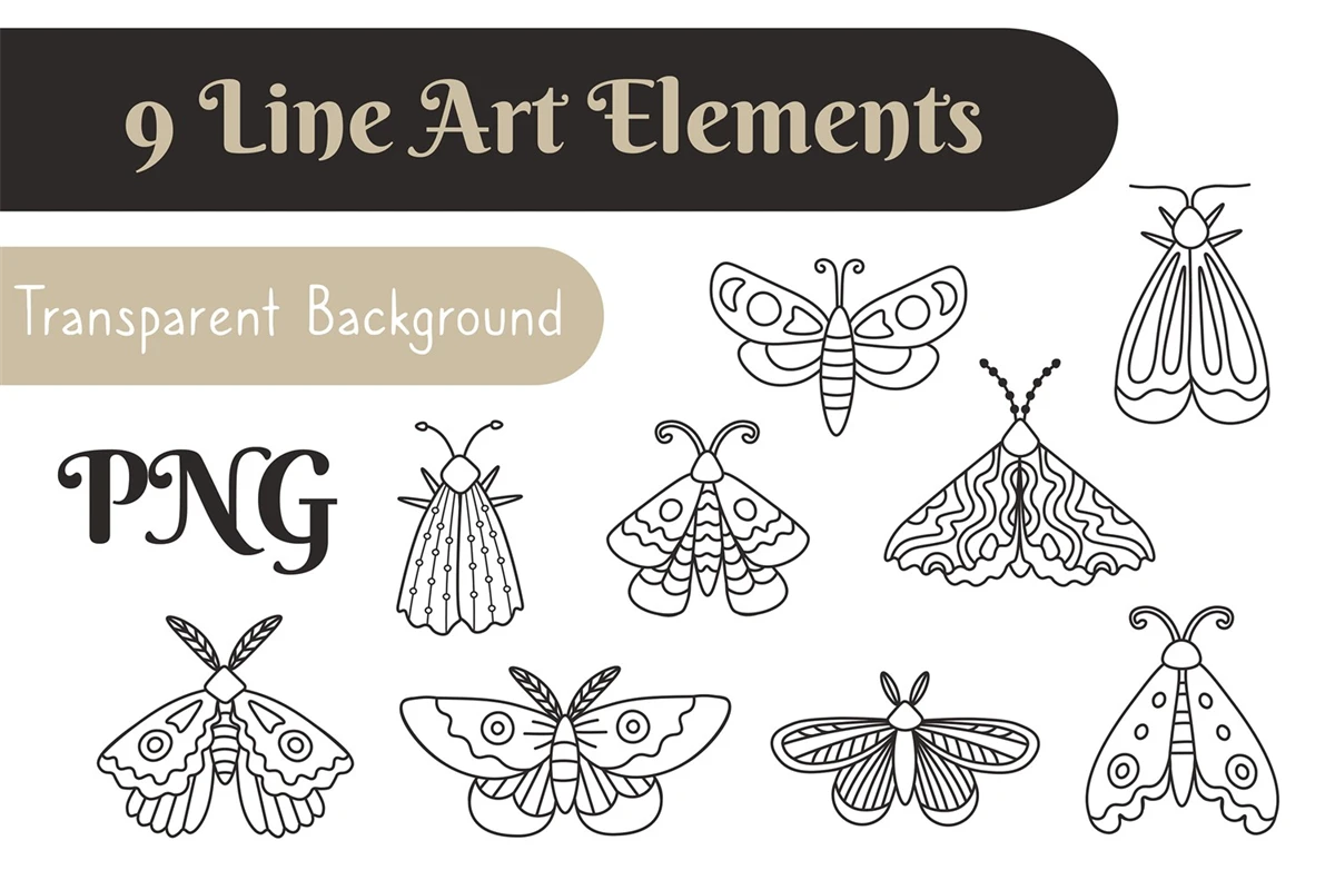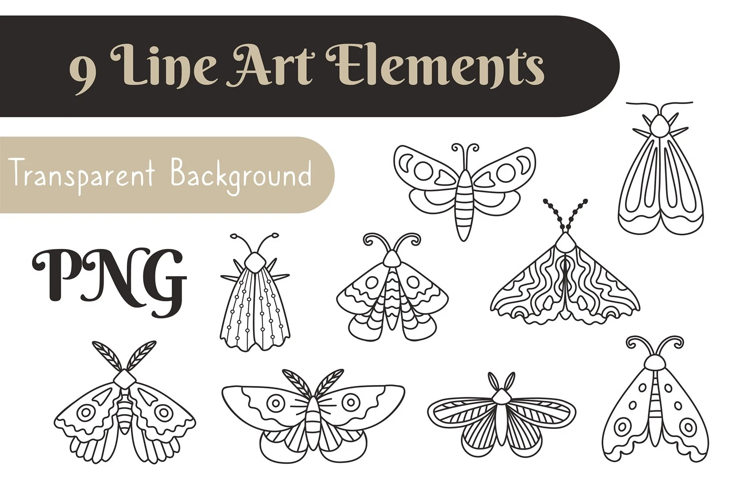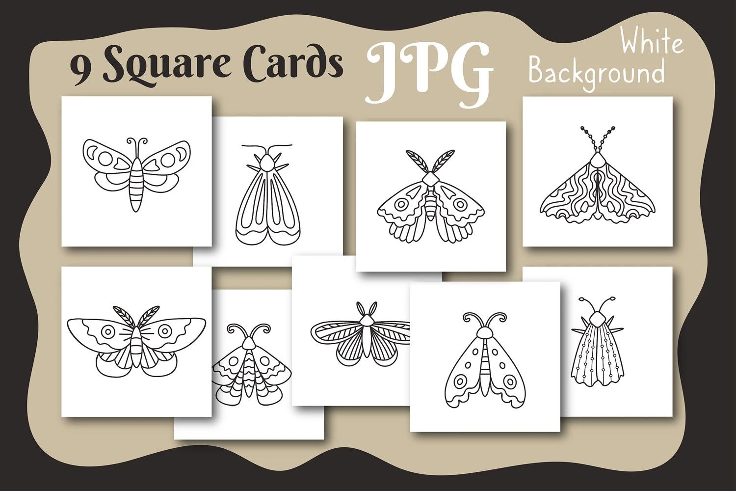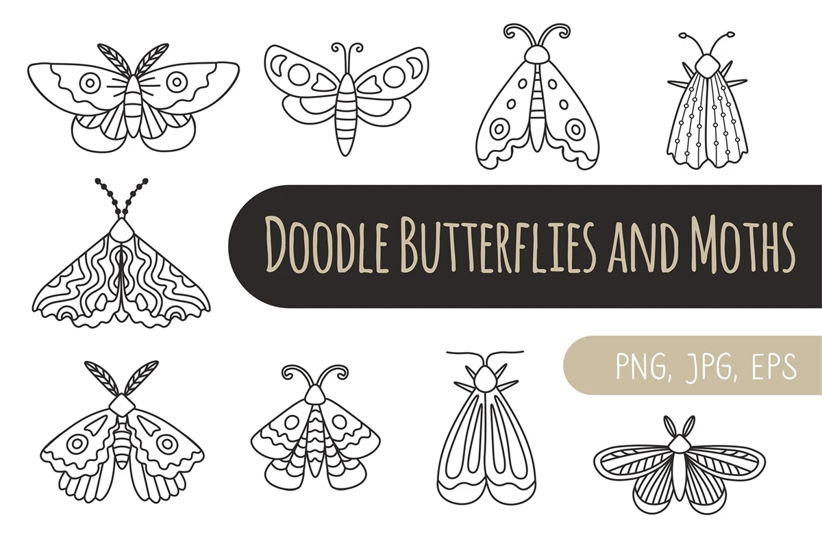 Doodle Moths And Butterflies Collection includes 9 black line art insects.They are perfect for kids, astrology, mystery, esoteric topics, stylish sublimation, t-shirt prints, postcards, posters, greeting and business cards, wall arts, social media, phone cases, etc.