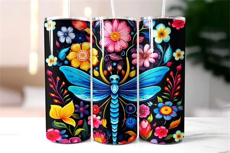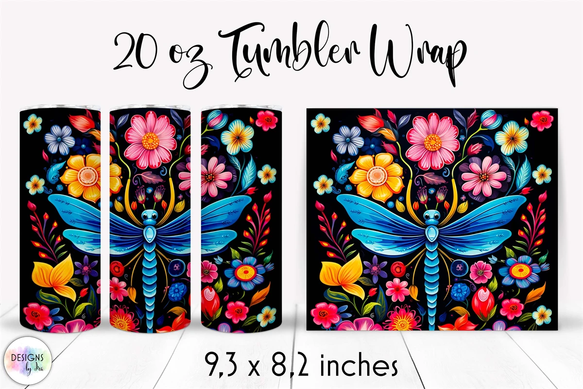 Dragonfly Tumbler Wrap, Folk Art Style Dragonfly Floral PNG