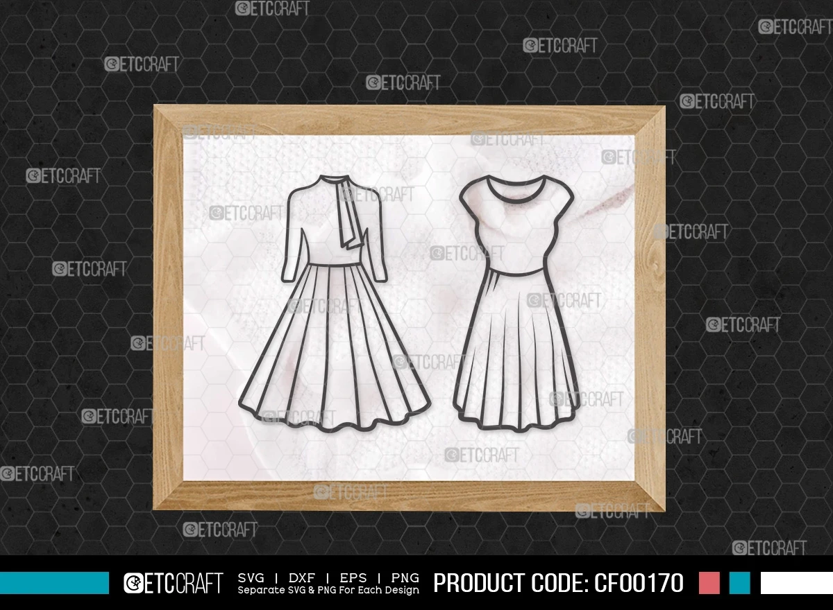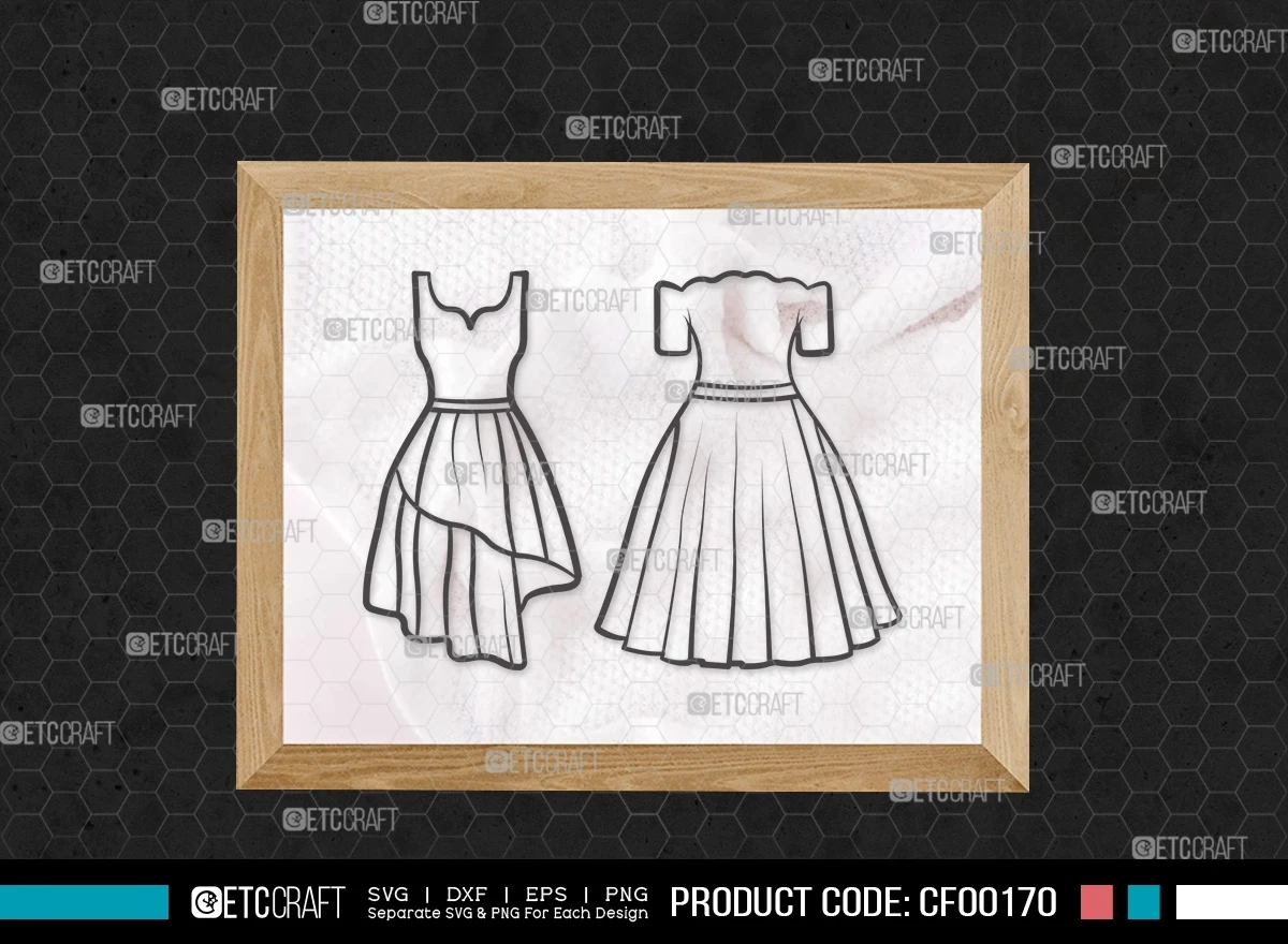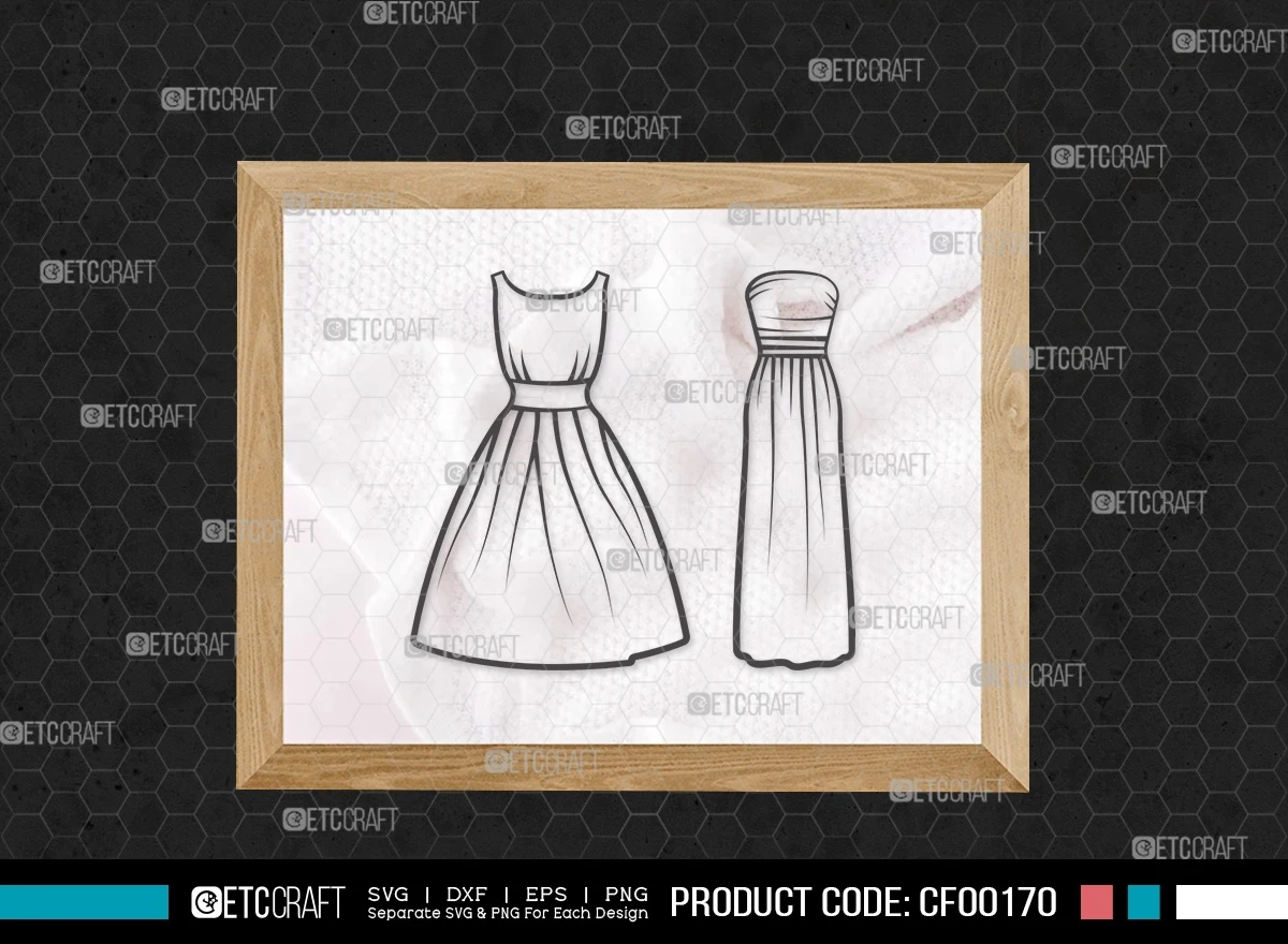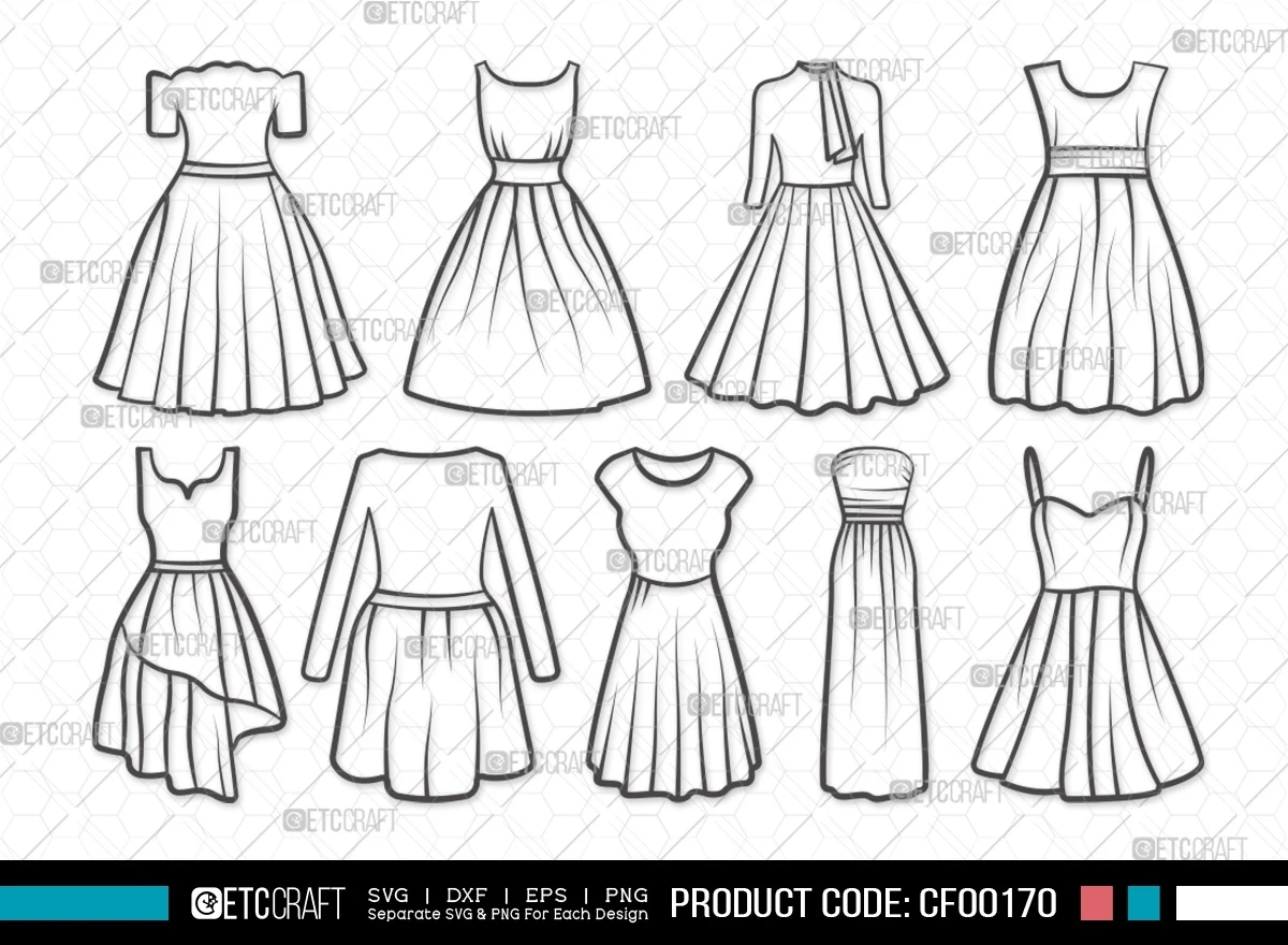 Enhance your creative projects with our Dress Outline Women's Wedding Long Gown Dresses SVG Cut File Bundle. This digital collection features meticulously designed SVG, DXF, EPS, and PNG files, showcasing elegant dress outlines perfect for various occasions. Elevate your designs and bring sophistication to your creations with this versatile bundle.