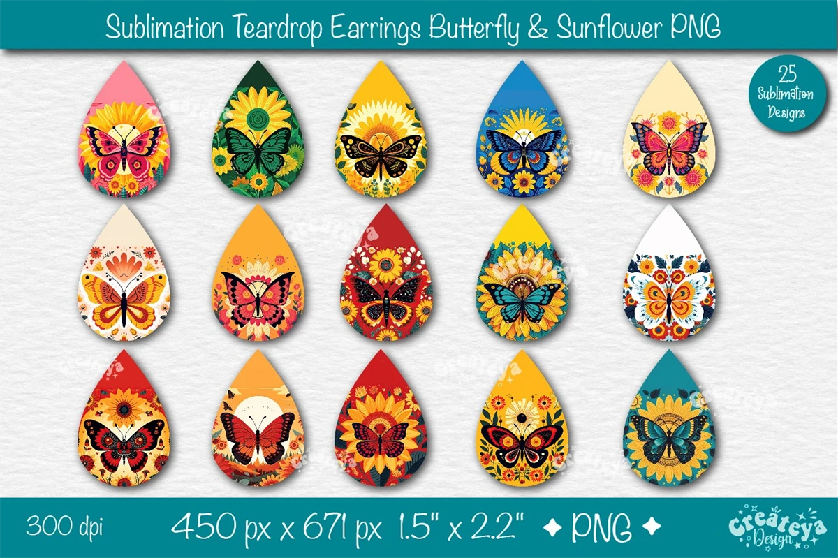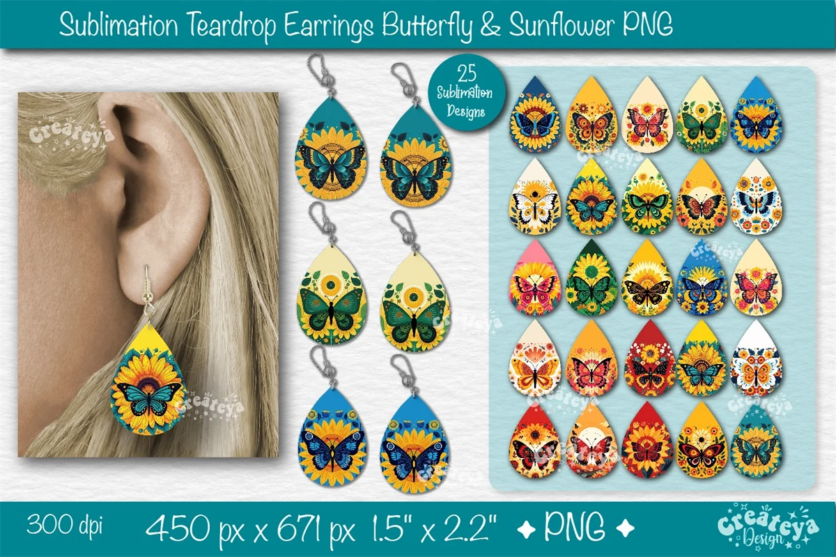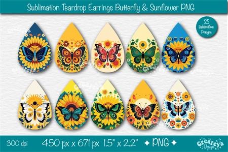 The teardrop earrings sublimation bundle with Butterfly Sublimation and Sunflower is perfect for summer teardrop earrings. Country-style Teardrop earring sublimation bundle PNG contains 25 teardrop earring designs.