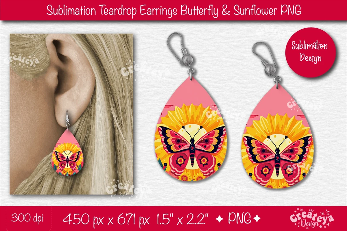 The teardrop earrings sublimation with Butterfly Sublimation and Sunflower is perfect for summer teardrop earrings. Country-style Teardrop earring sublimation PNG.