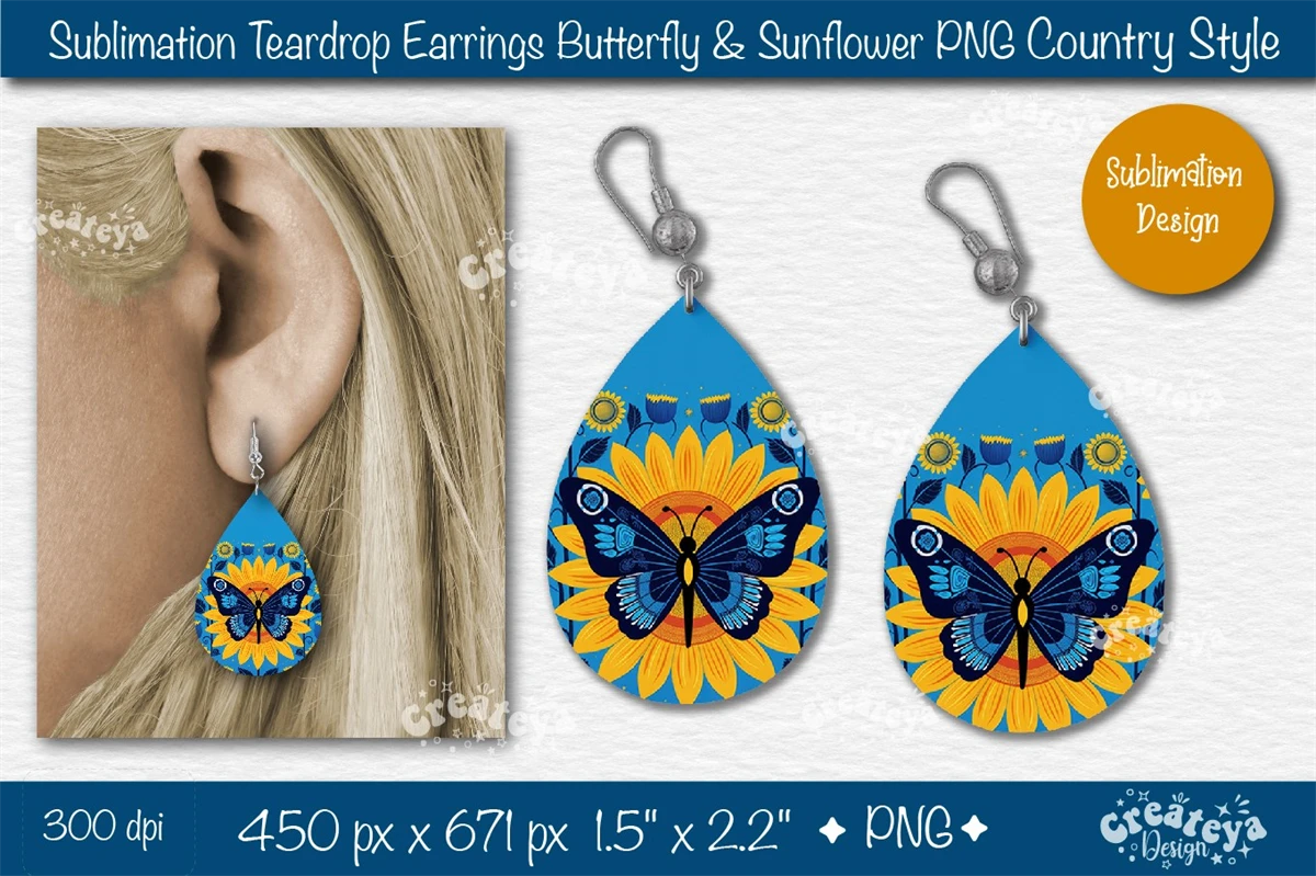 The teardrop earrings sublimation with Butterfly Sublimation and Sunflower is perfect for summer teardrop earrings. Country-style Teardrop earring sublimation PNG.