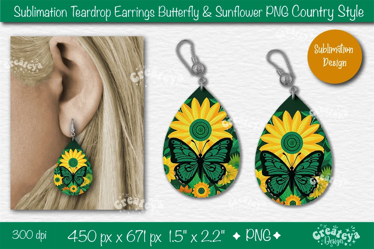 The teardrop earrings sublimation with Butterfly Sublimation and Sunflower is perfect for summer teardrop earrings. Country-style Teardrop earring sublimation PNG.