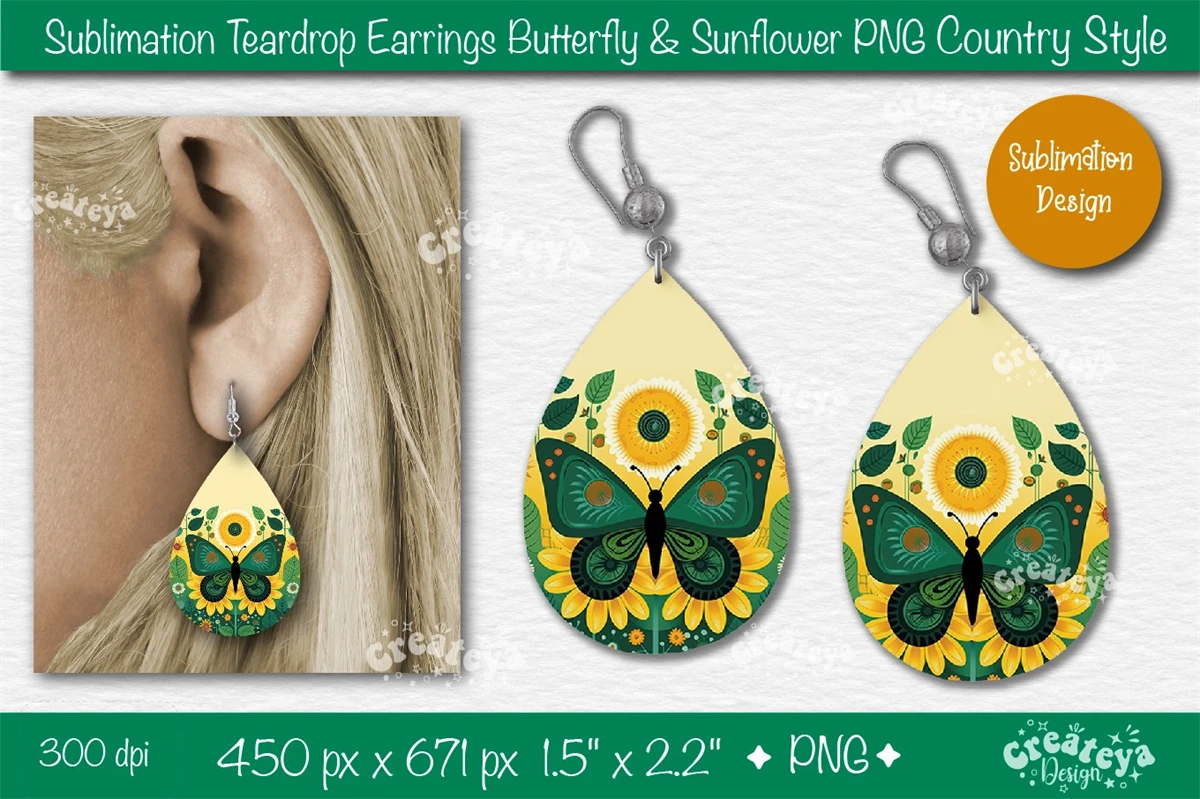 The teardrop earrings sublimation with Butterfly Sublimation and Sunflower is perfect for summer teardrop earrings. Country-style Teardrop earring sublimation PNG.