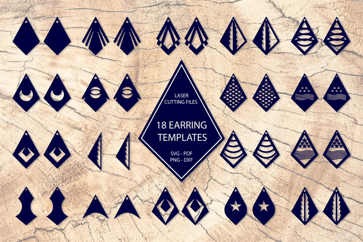 You'll receive ZIP folder with 18 SVG, 18 PDF, 18 DXF, 18 PNG of each earring template.