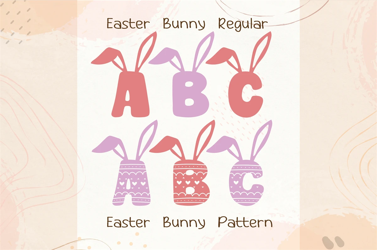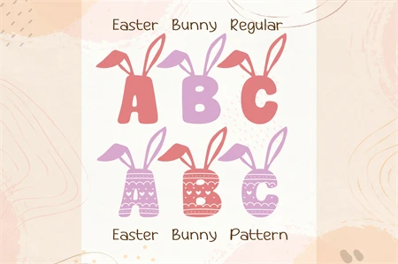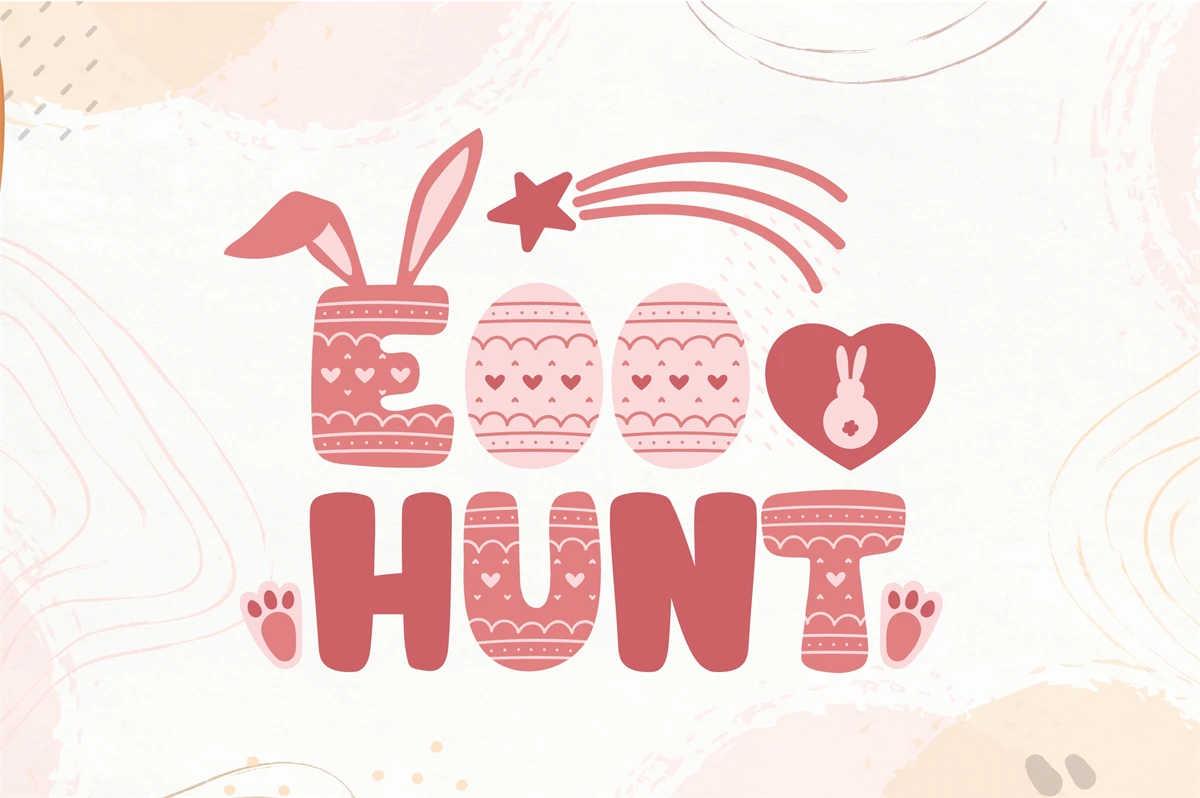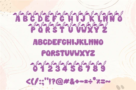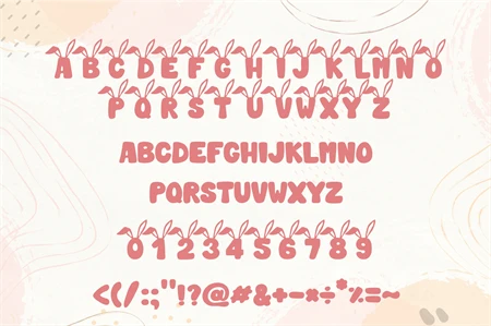 Easter Bunny is a whimsical and adorable display font that is sure to make your designs pop. Featuring tiny hearts and lines inside each letter and cute bunny ears on top, this font is playful and fun, perfect for childrens books, greeting cards, and any project that needs a touch of sweetness.