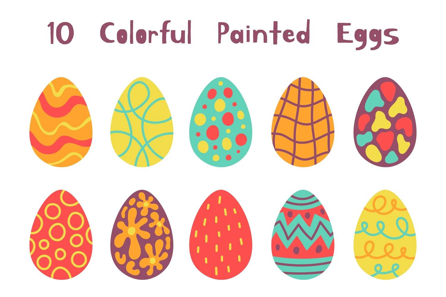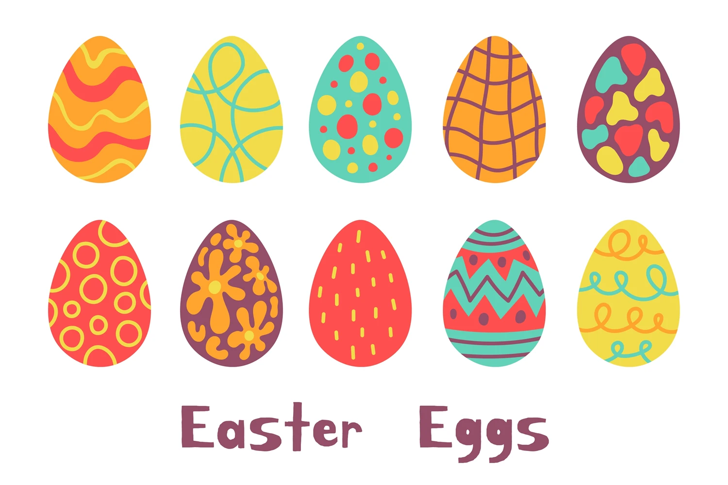 Modern colorful Easter eggs bundle in hand drawn style. Vibrant colored minimal abstract design with various playful textures. Cute positive design elements. Happy Easter PNG clipart. Bright vector illustration for kids.