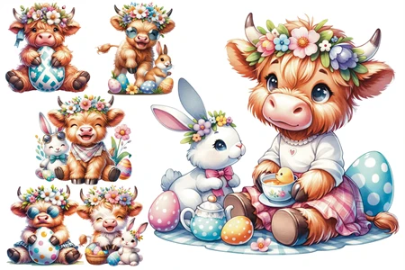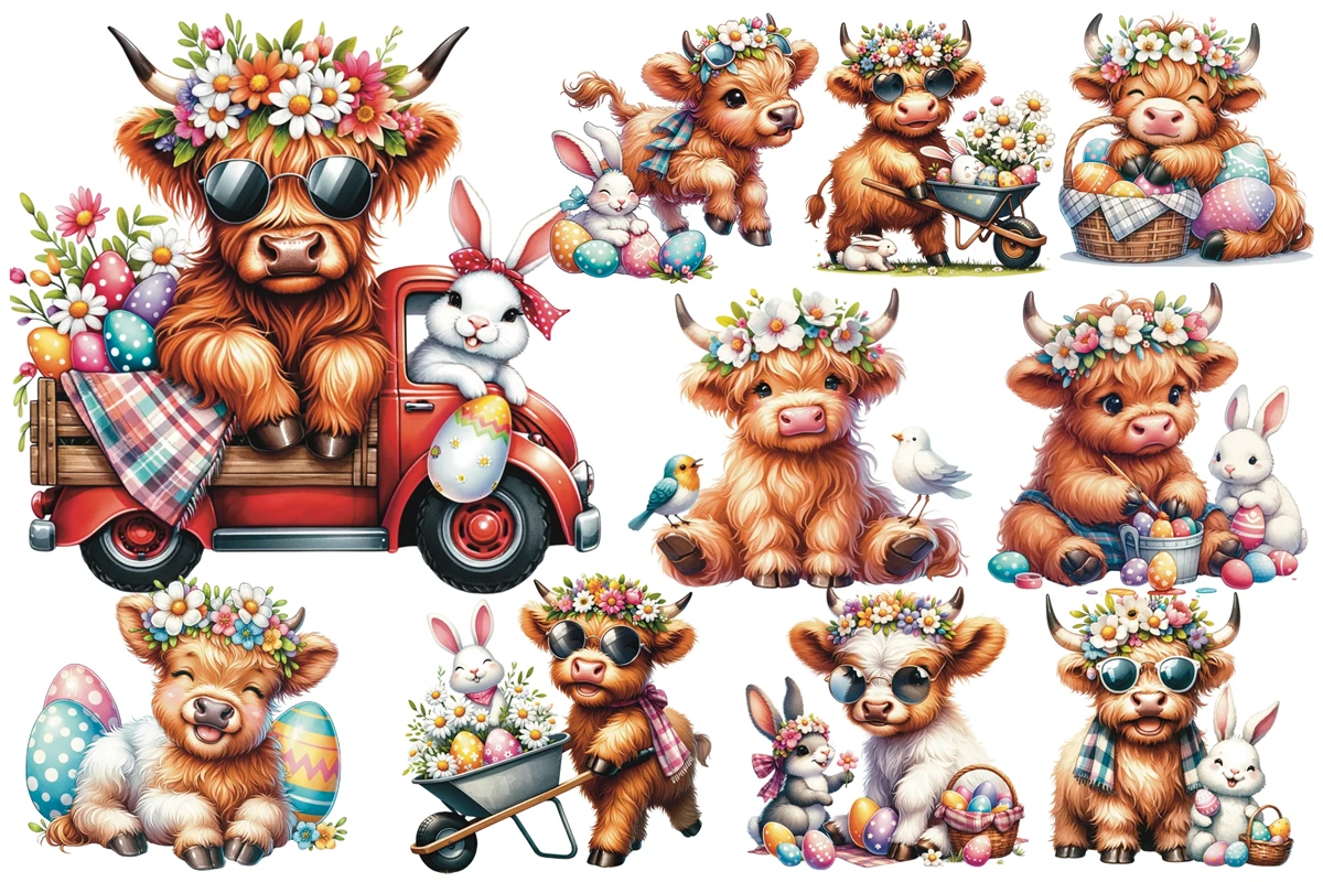 Easter Highland Cow, Happy Easter Sublimation Design, Highland Cow Clipart, Baby Cow Clipart Bundle, Easter PNG