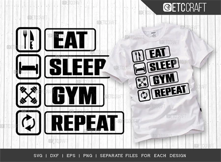 The Eat Sleep Gym Repeat SVG Bundle features powerful gym-related quotes and symbols, inspiring you to push your limits and stay dedicated to your fitness goals.