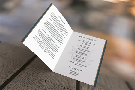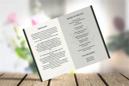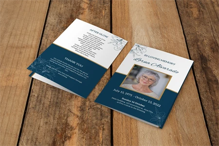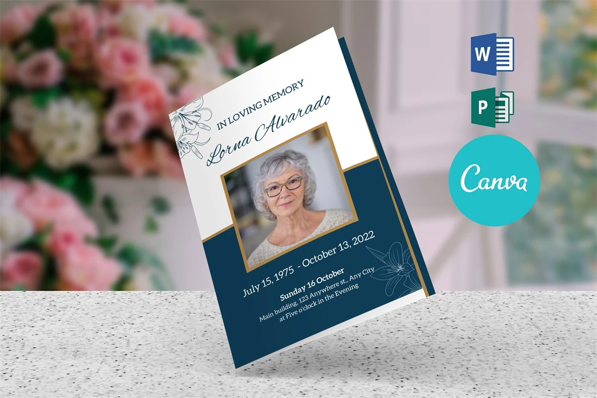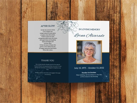 Capture the essence of your loved one's memory with our Editable Blue and Gold Frame with Lilium Floral Funeral Program Template. This thoughtfully designed 4-page booklet serves as a heartfelt tribute to the women who touched your life, featuring a delicate balance of warmth and sophistication.