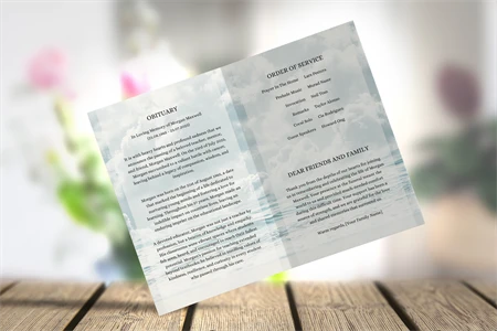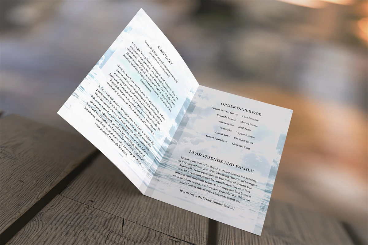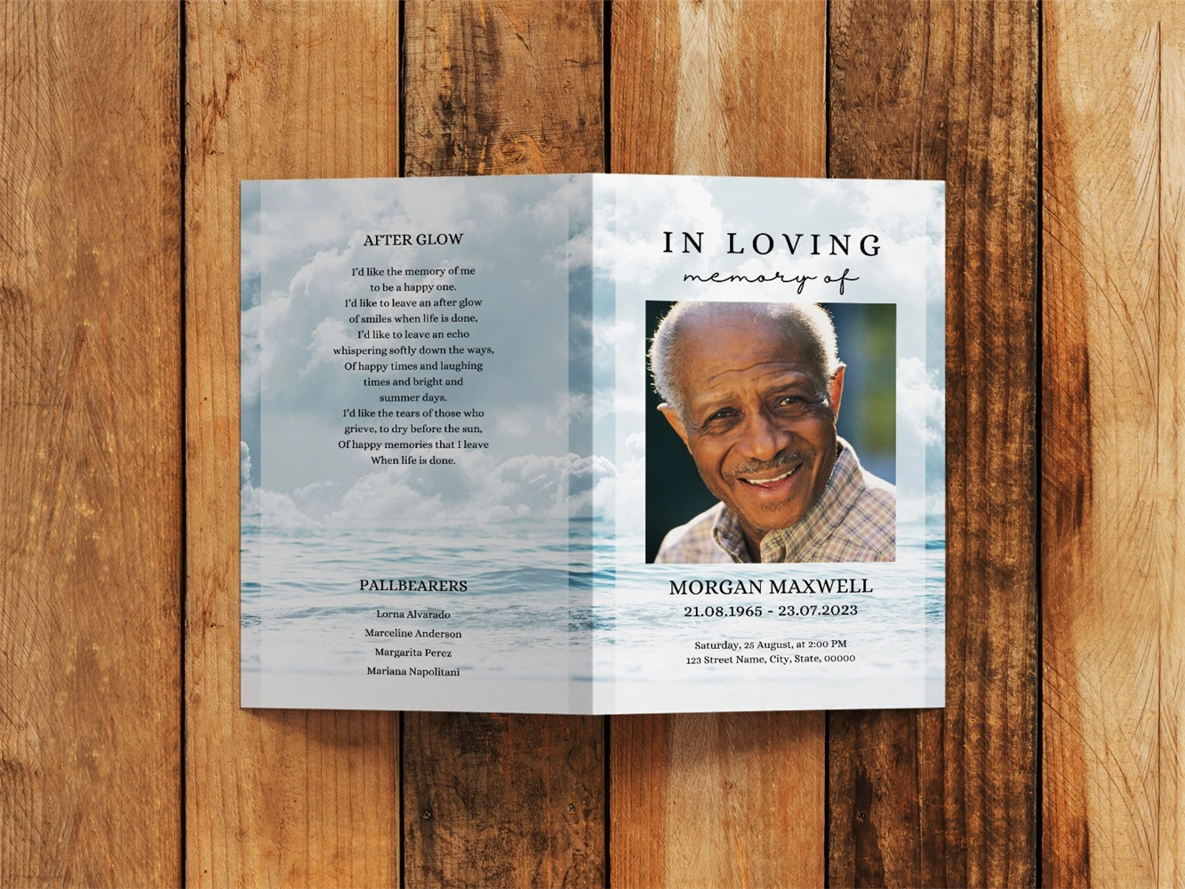 Introducing our 'Heavenly Sky' Editable Funeral Program Template, a tender homage presented in a 4-page booklet. Crafted for loving remembrance, this template serves as a heartfelt tribute to honor and celebrate the life of a cherished individual. Compatible with Word, Publisher, and Canva, it offers a seamless and personalized way to create a lasting memorial. Design a meaningful keepsake that reflects the essence of your cherished memories with this professionally crafted template.