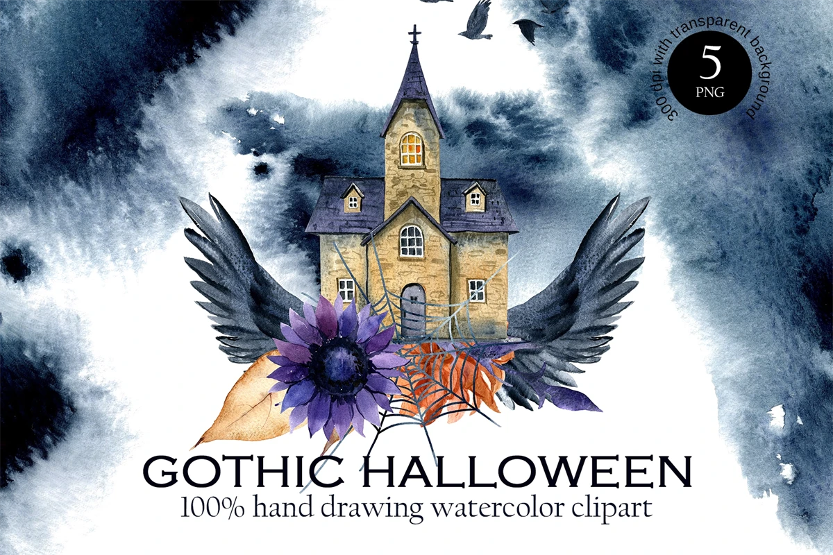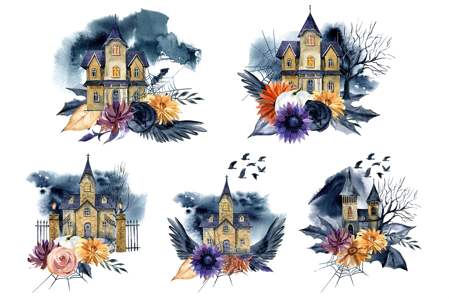 This collection of Watercolor Gothic Halloween Houses Clipart is perfect for adding a spooky and mysterious touch to your Halloween-themed projects. The clipart features intricate and detailed illustrations of haunted houses, complete with creepy elements like bats, ghosts, and spiderwebs.
