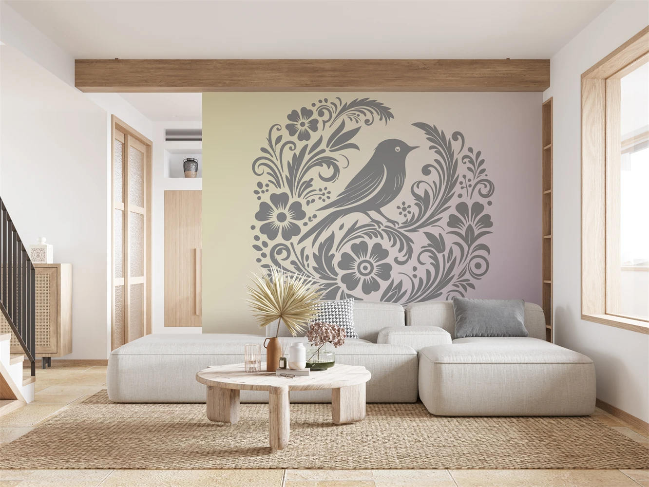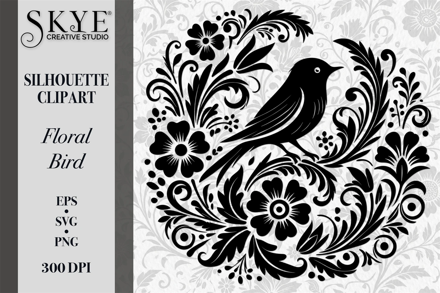 Elegant Black and White Little Bird Silhouette Illustration with Floral Motifs