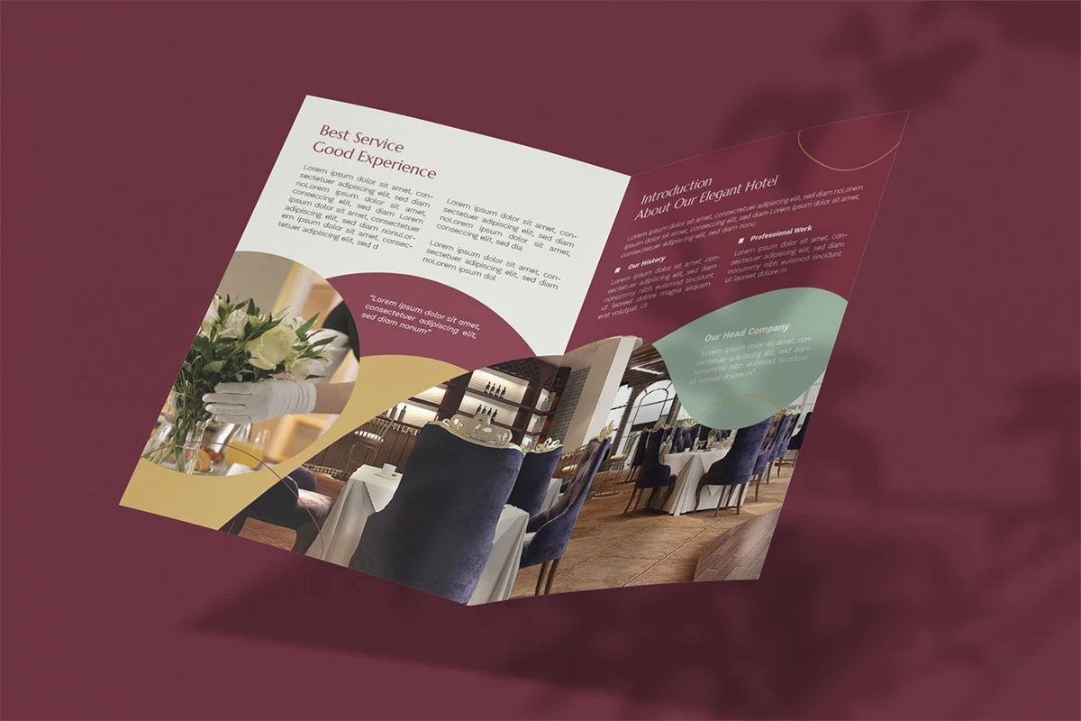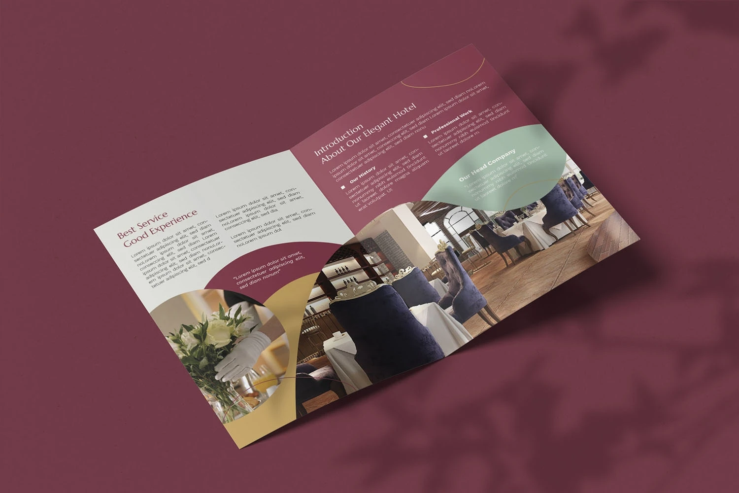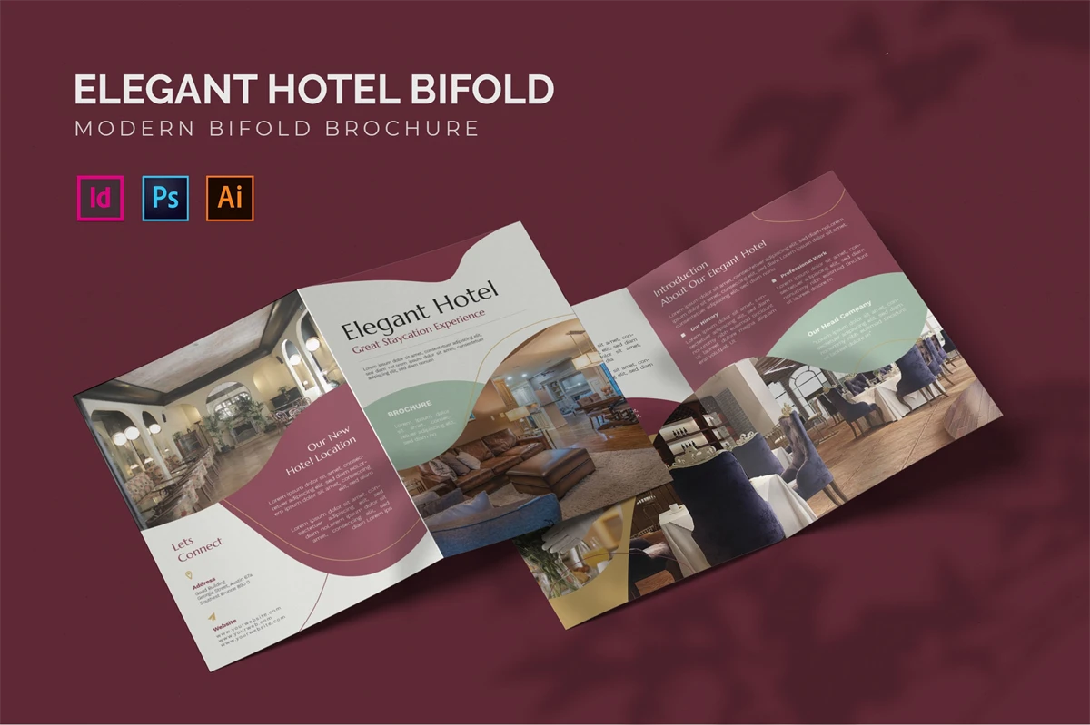 Elegant Hotel - Bifold Brochure We present this Bifold Brochure for you, simple and very elegant, and this Bifold Brochure is suitable for all types of your business, made with Adobe InDesign (INDD), Adobe Photoshop (PSD) and Adobe Illustrator (AI), very easy to customize, Hope you Like it, dont forget to rate, Thanks.