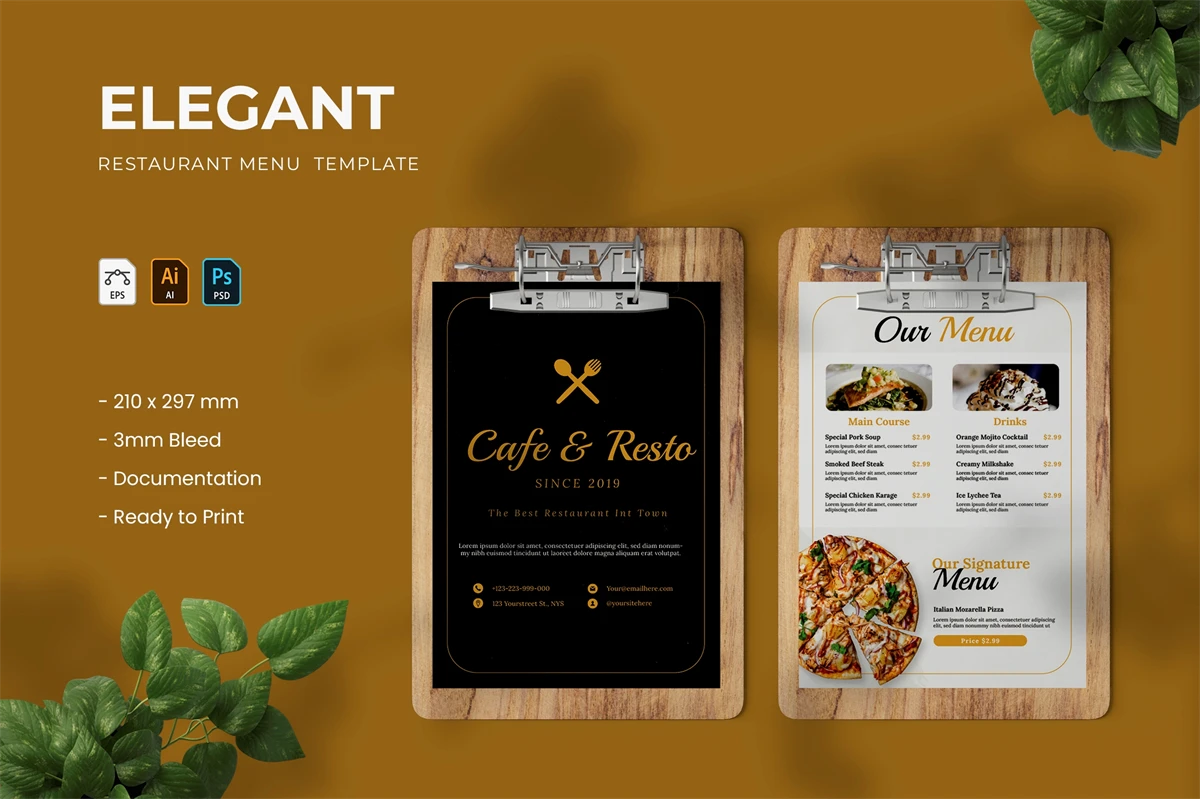 Menu Restaurant Template is a menu template for people who sell, business, or run a food-related business. The layout makes it easy to find the menu you want. Too many choices can make customers feel overwhelmed, so its better to limit the number of choices, colors, and other design elements so that customers can easily scan and order items.