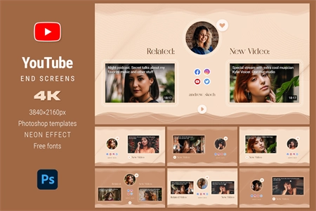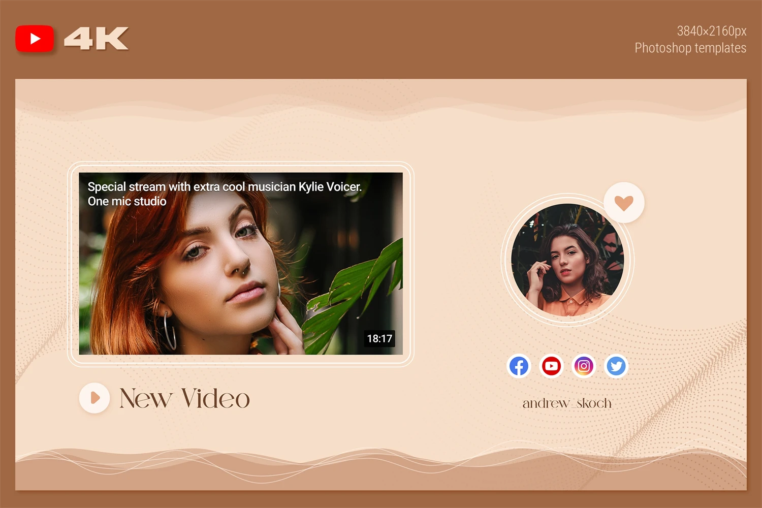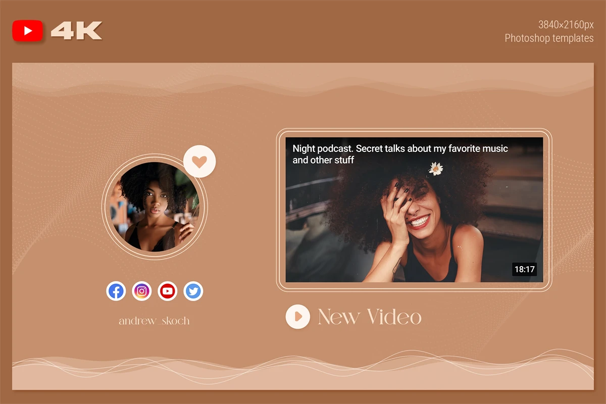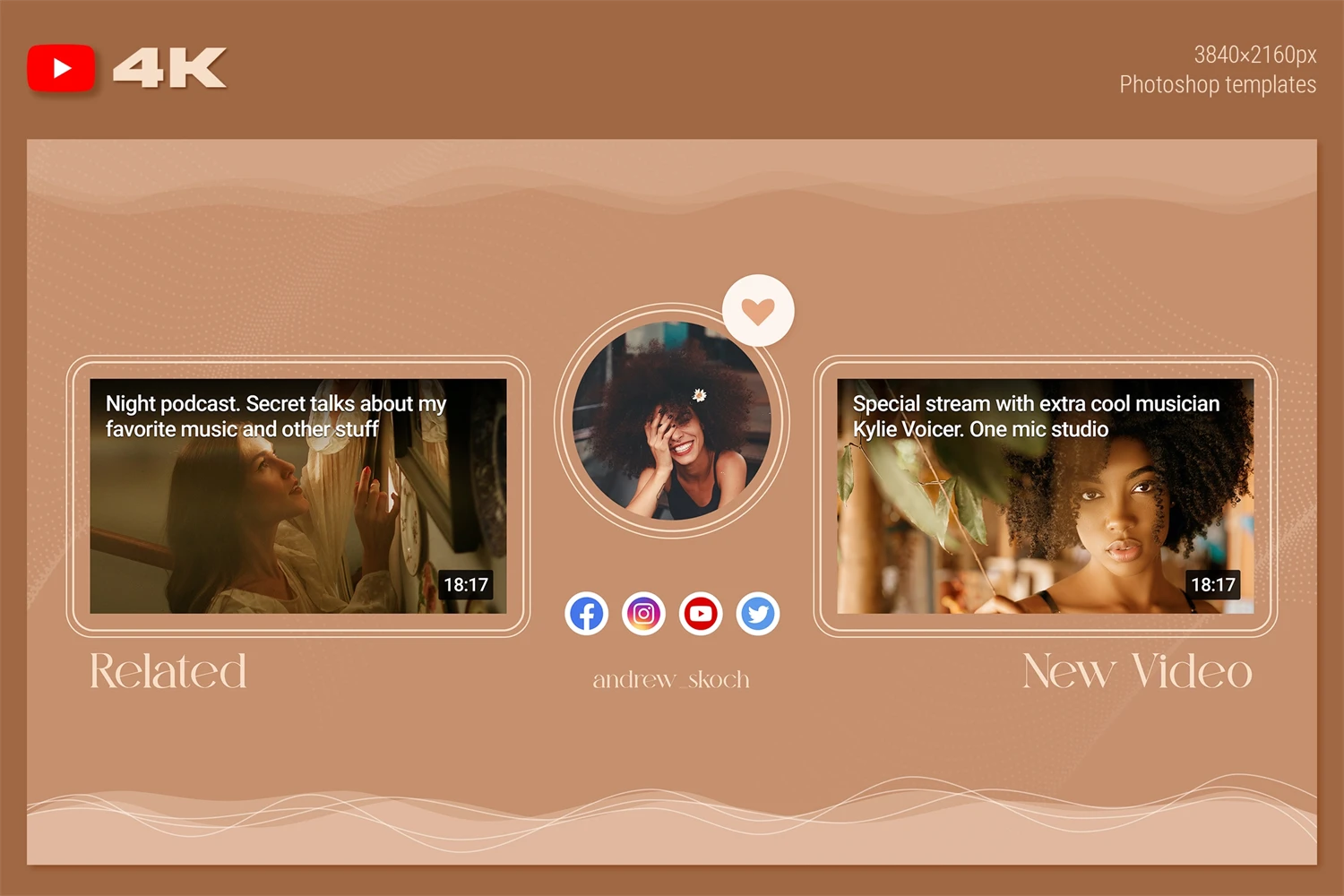 Great for video bloggers, video makers, video creators, YouTube creators, podcasters, talk shows, YouTube podcasts. Special places for new video, related video, playlist and YouTube profile avatar.