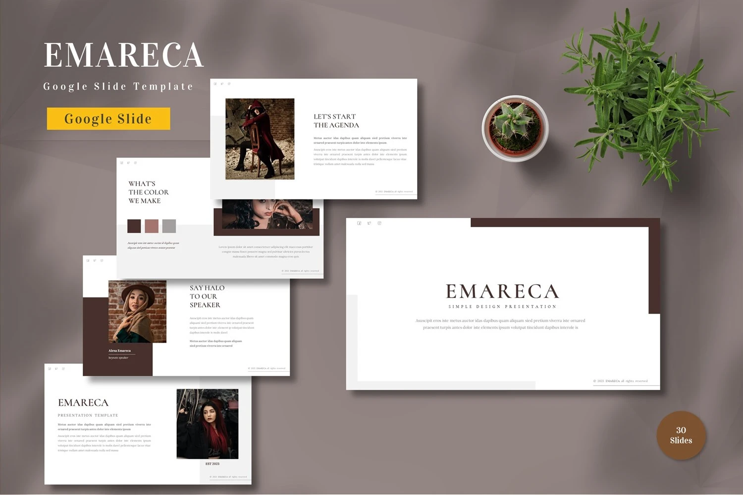 Get it now! **Emareca - Google Slide Template** for All Business and Personal Needs All elements on this template are editable; input your content, replace your image with a placeholder, change the color, and all presentations include an animated slide to present your slides.
