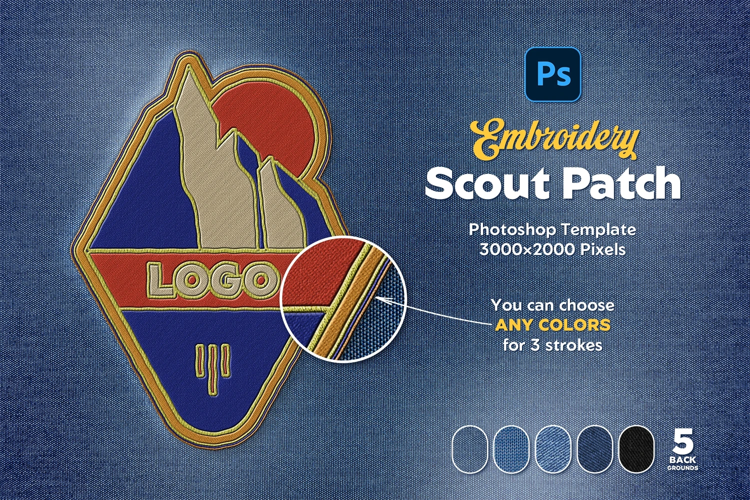 The "Embroidery Patch Mockup" is a high-quality Photoshop template designed for showcasing embroidered patches. With a resolution of 3000x2000 pixels at 300 dpi, this mockup ensures that your designs will look crisp and detailed.