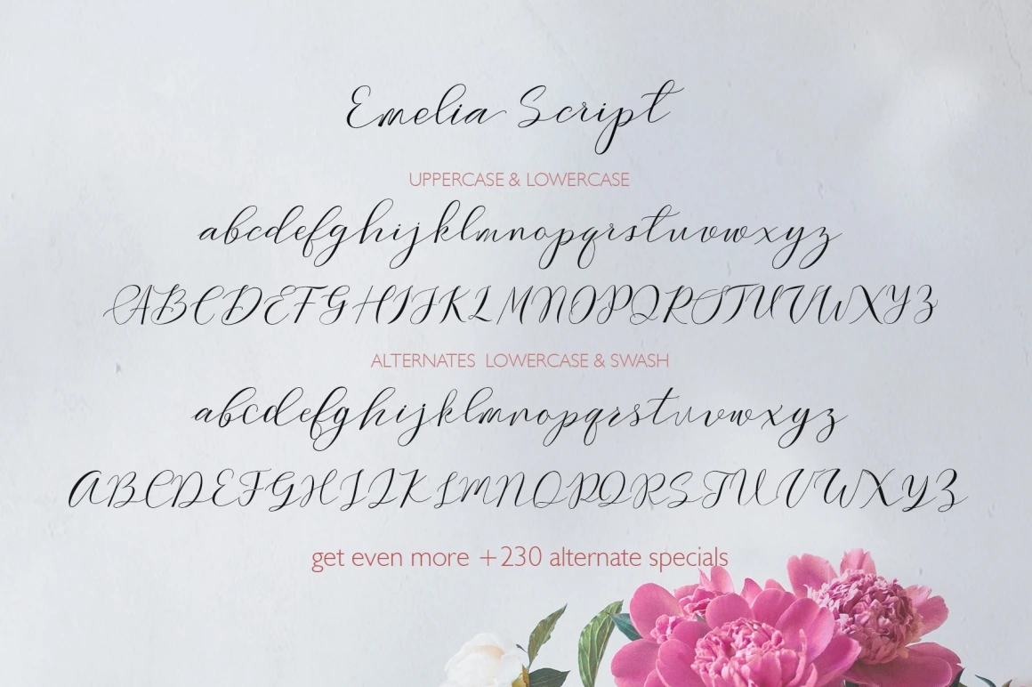 Emelia Script: Uppercase & Lowercase International Language & Symbols Support Punctuation & Number PUA Unicode Range Standard Stylistic Alternates Stylistic Character Variant of ligatures.