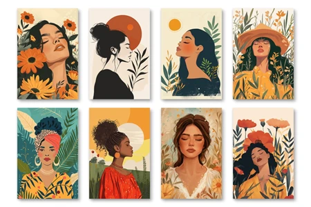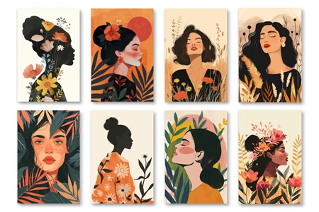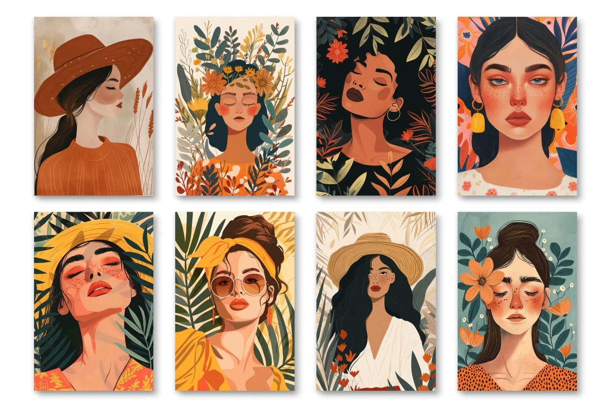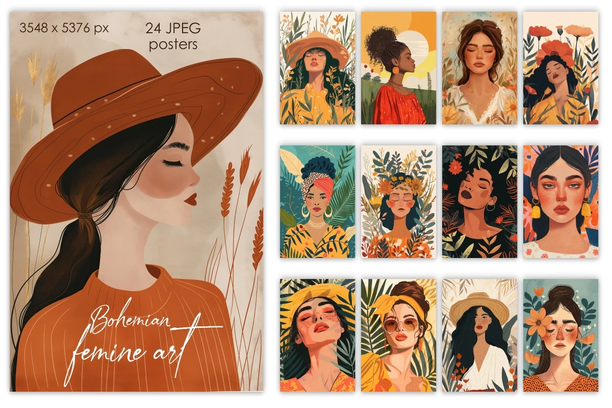 Each digital portrait has been crafted with care, featuring women adorned in Boho attire, surrounded by florals and nature-inspired elements that capture the free-spirited essence of Bohemian chic. The warm, earthy color palettes are complemented by bold, expressive brushwork, marrying modern design sensibilities with the rustic allure of Bohemian artistry.