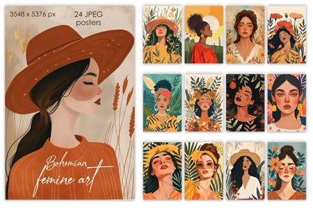 Step into a world of grace and natural elegance with our Bohemian Femme Art Collection. This exclusive digital suite offers a curated selection of 24 JPEG files, each portraying the serene beauty of feminine portraits enshrined in the timeless Boho style. Designed with an artist's touch, these pieces are perfect for a wide array of applications, including wall art, posters, greeting cards, and prints, bringing a touch of sophistication and cultural charm to any space.