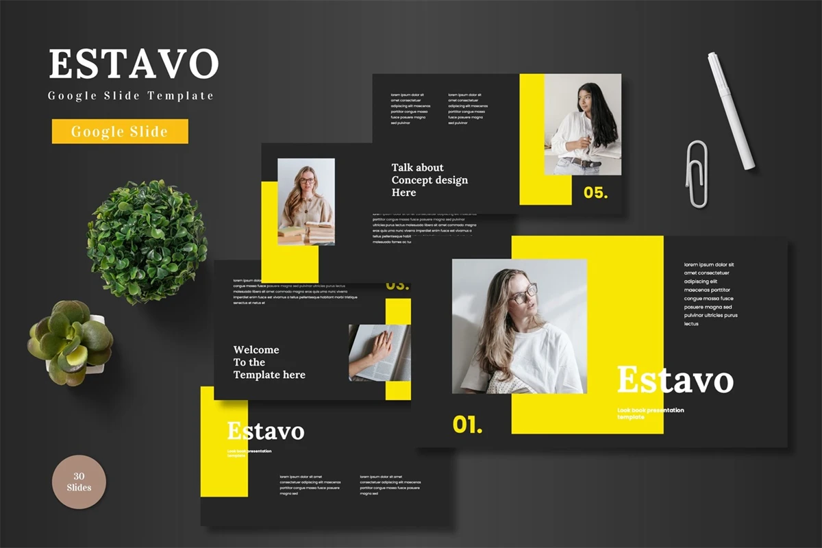 This is **Estavo - Google Slide Template** - Get it now! Google Slides is a great template ready to use. Clean, scalable, colorful, and multipurpose. Suitable for Business, Pitch Deck, E-commerce, or Product promotion purposes.