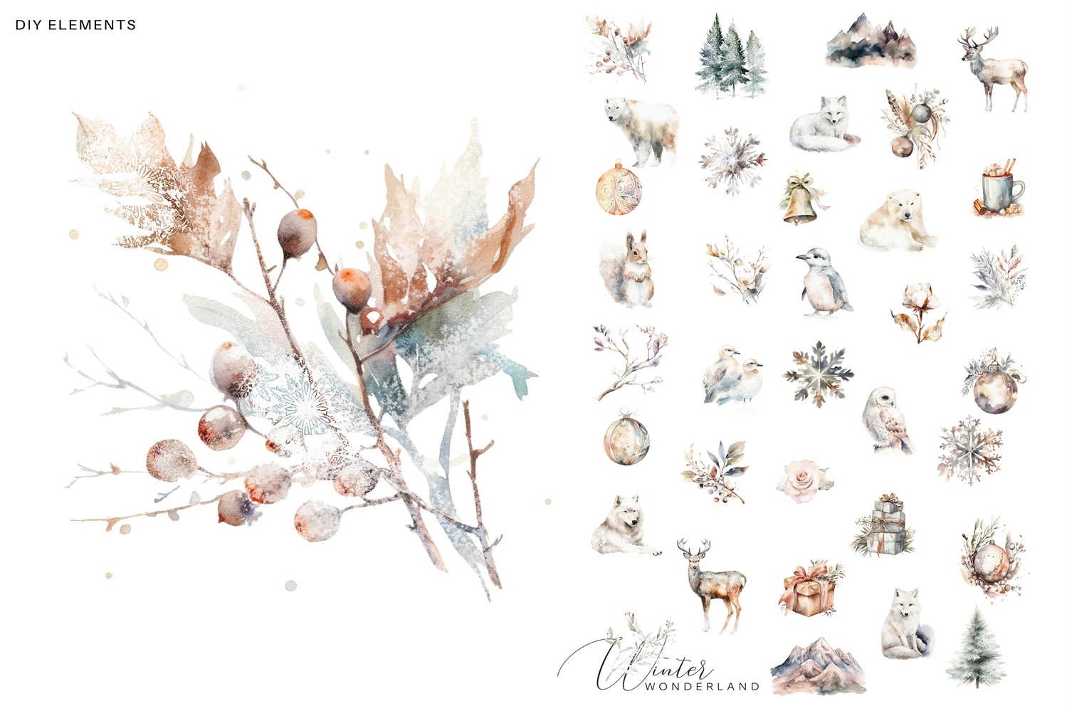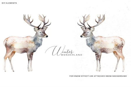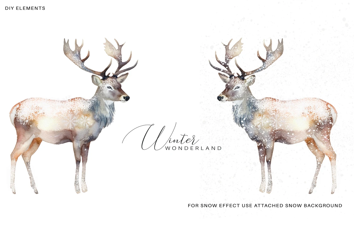 Welcome to a winter wonderland of clipart! This delightful collection captures the serene beauty of the season and woodland charm. Explore the enchanting world of deer clipart in PNG format, where you'll find graceful woodland creatures in various poses. Immerse yourself in the tranquil atmosphere of watercolor winter landscapes and the cozy magic of winter woodlands. For a touch of holiday spirit, indulge in the elegance of watercolor Christmas elements, featuring evergreen clipart and festive decor. Complete your woodland scene with forest animals, including the majestic watercolor pine, the whimsical snow clipart, and charming creatures like the fox and owl in their watercolor renditions. This versatile set is perfect for adding a touch of seasonal charm to your design projects, whether you're creating holiday decorations, invitations, or simply want to embrace the peaceful allure of winter.
