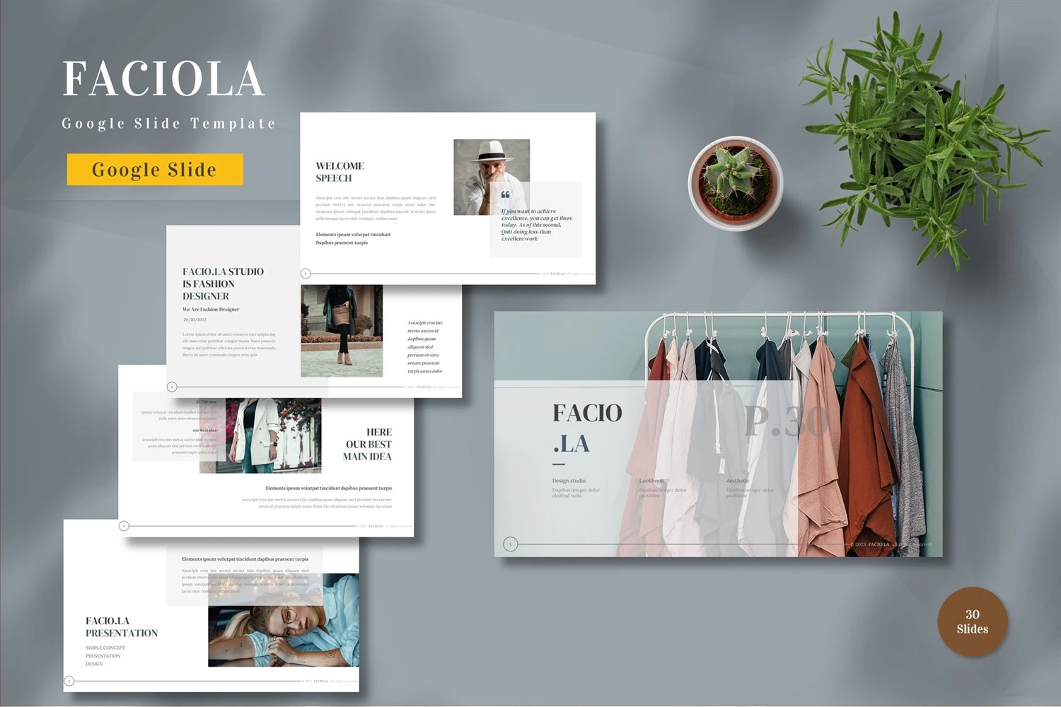 Get it now! **Faciola - Google Slide Template** for All Business and Personal Needs All elements on this template are editable; input your content, replace your image with a placeholder, change the color, and all presentations include an animated slide to present your slides.
