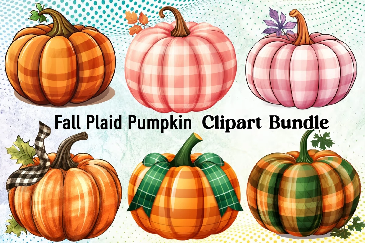 Watercolor Fall Plaid Pumpkin Clipart PNG Bundle