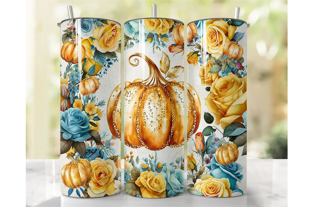 20 oz tumbler wrap Fall design with gold pumpkin and florals.