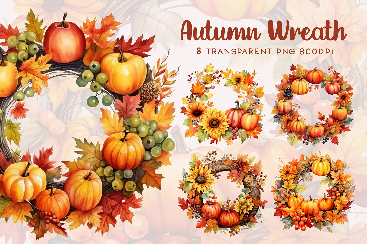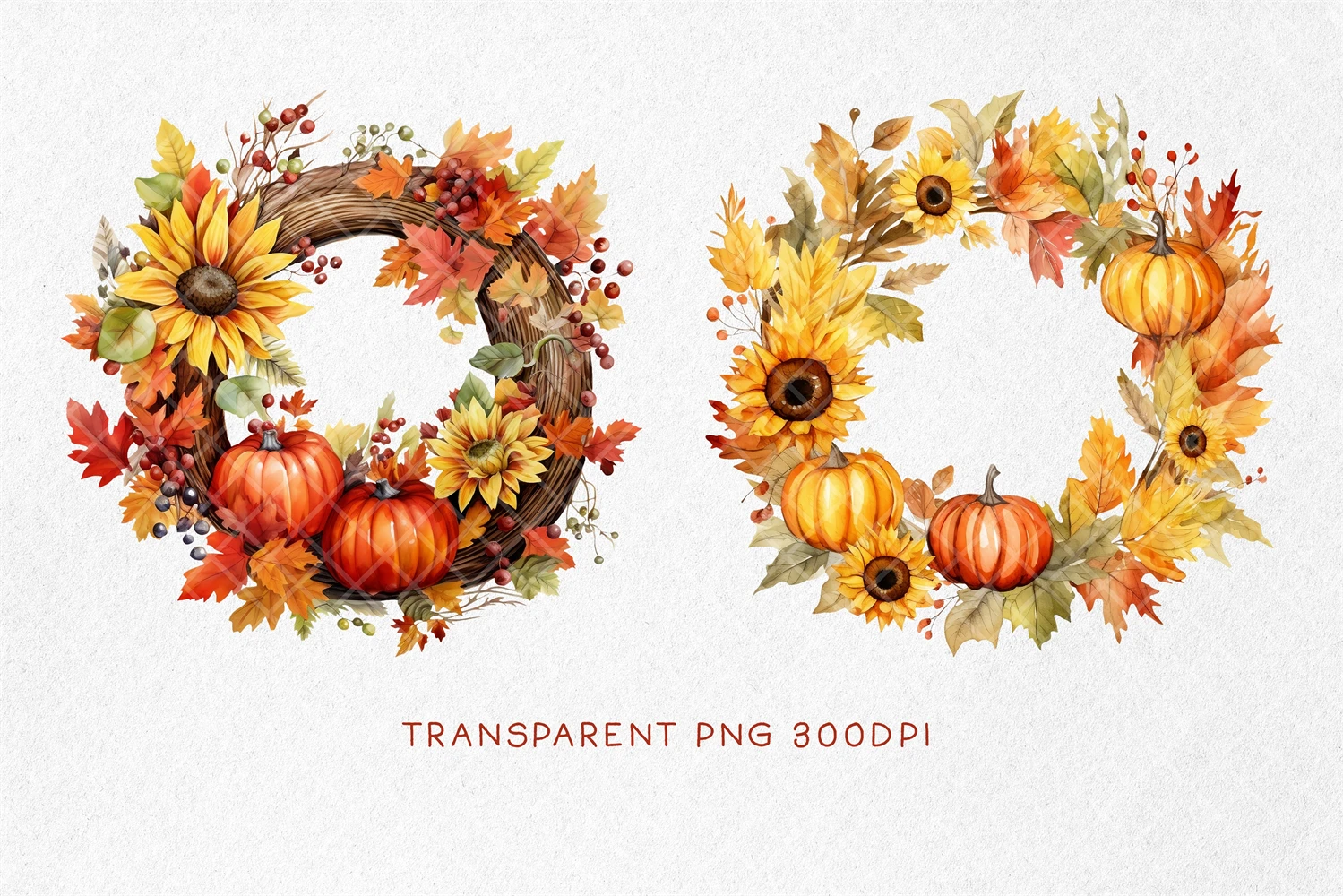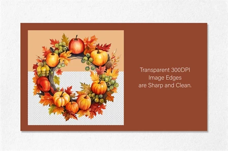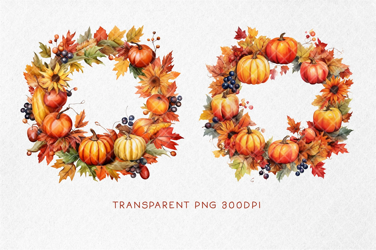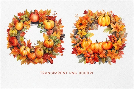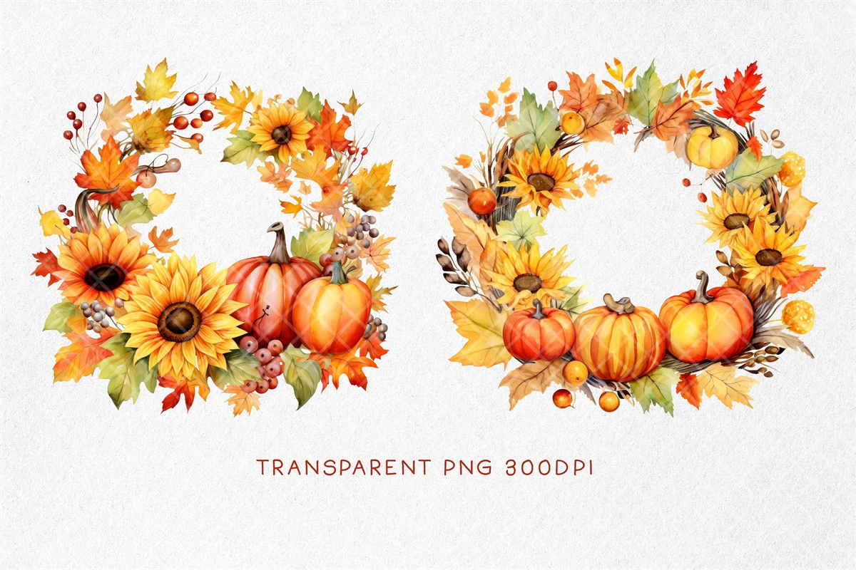 Fall Wreath PNG, Autumn Wreath PNG, Watercolor Autumn Harvest Circle Frame for Thanksgiving Sublimation, Autumn Thanksgiving Pumpkin. All elements are high-resolution (300dpi) PNG files with transparent backgrounds.