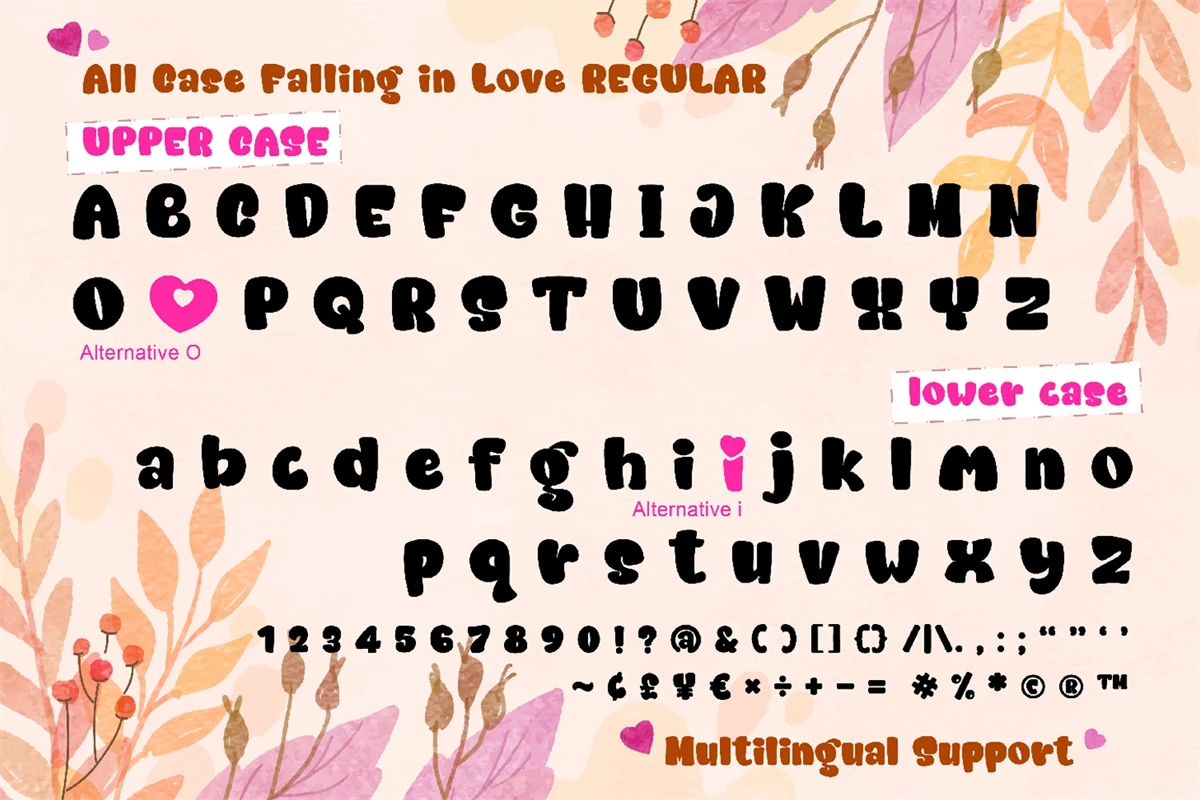 Falling In Love is a bubbly, chunky lettered, and friendly display font. It embodies playfulness and authenticity and is the perfect choice for any childrens activity or school design.