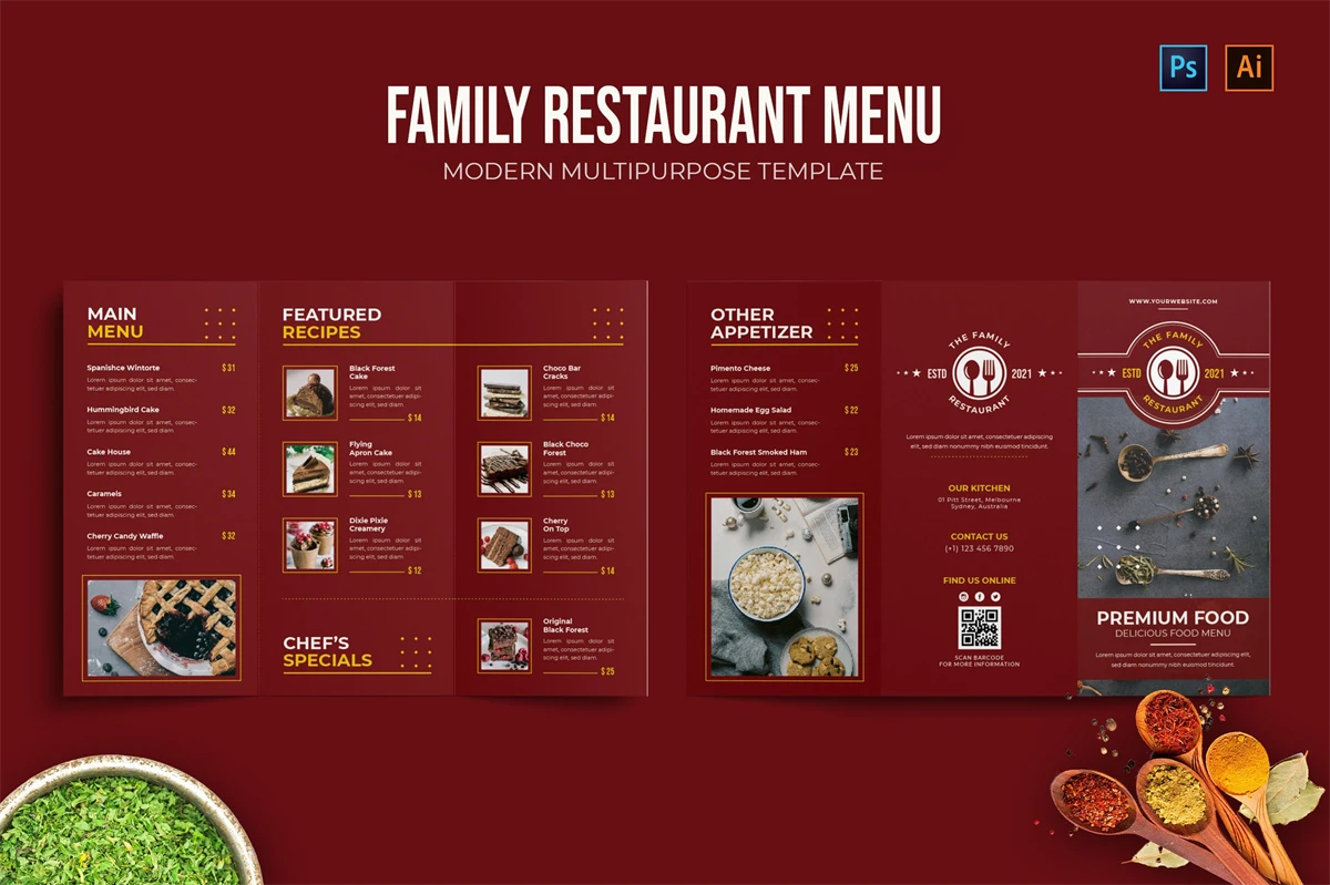Family - Restaurant Menu. This template is great for your business and will make your customers interested, elegant, and easily editable according to your needs, this restaurant menu is perfect for, promos, cafes, hotels, resort shops online. etc. I hope you enjoy this restaurant menu