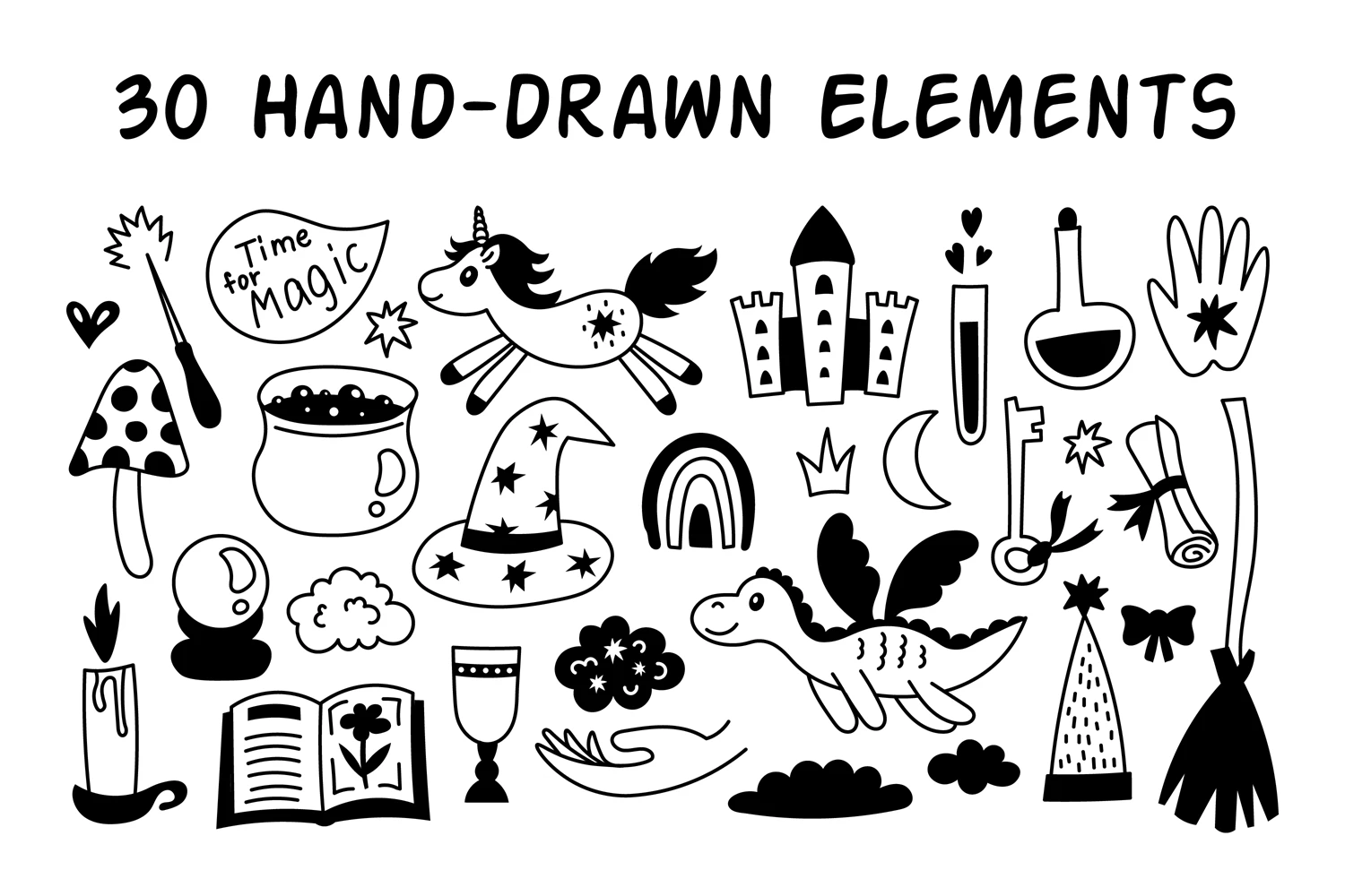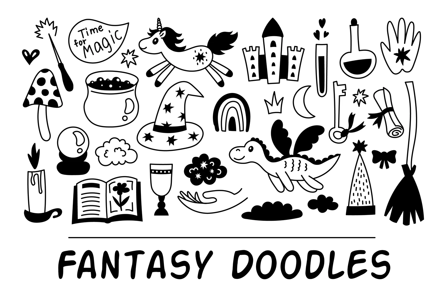 30 Fantasy doodles. Hand-drawn magic and fairy tale black line art elements in cartoon style. Ink drawn design for kids, products, greeting card, poster, invitation, marketing, etc. Vector illustration.