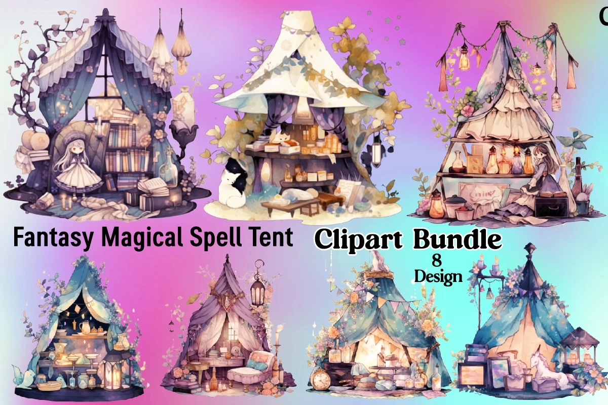 Watercolor Fantasy Magical Spell Tent Clipart PNG Bundle