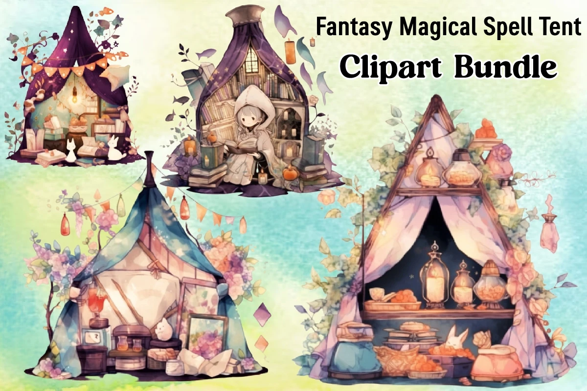 Watercolor Fantasy Magical Spell Tent Clipart PNG Bundle