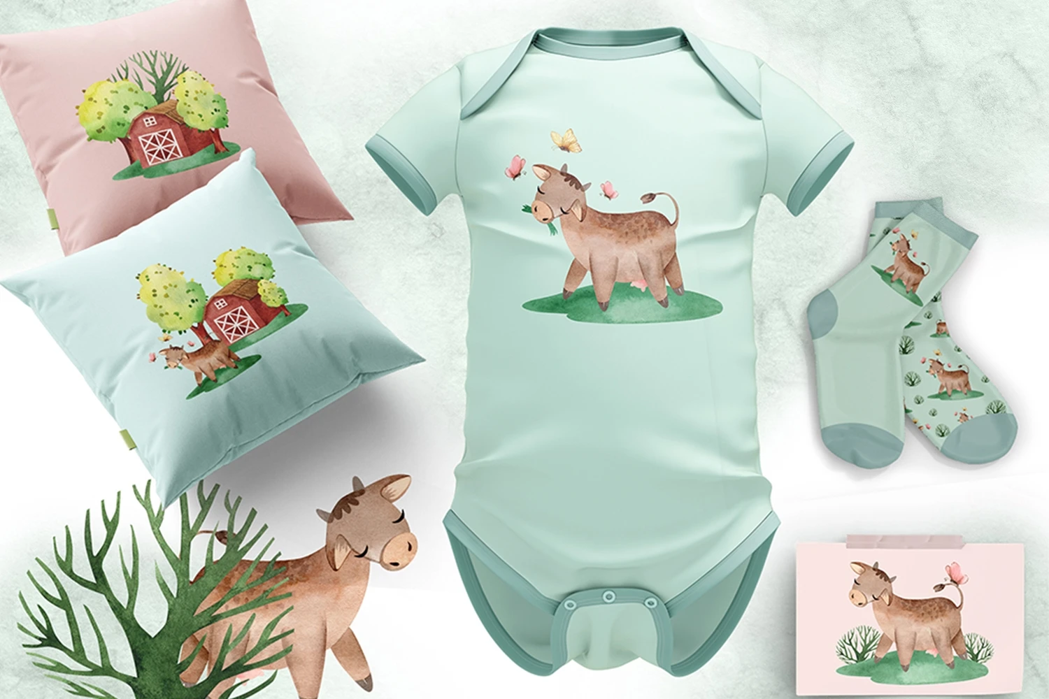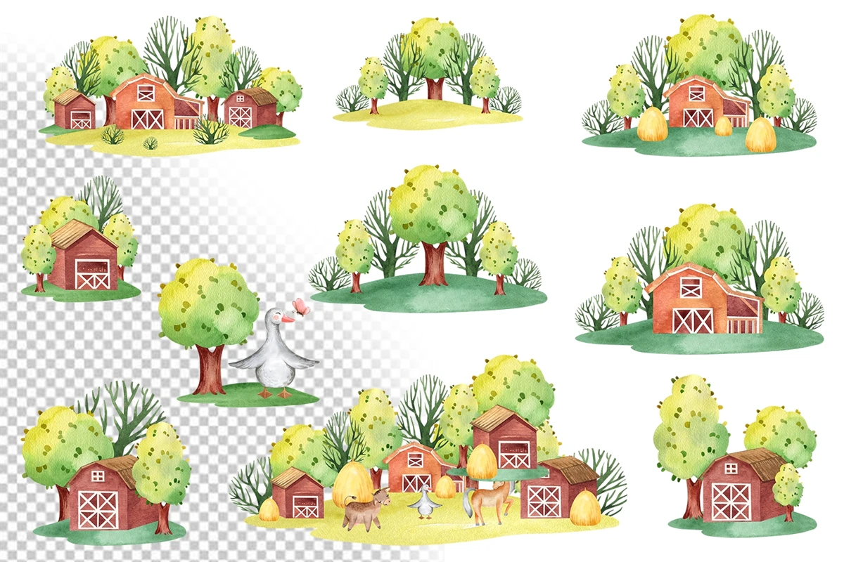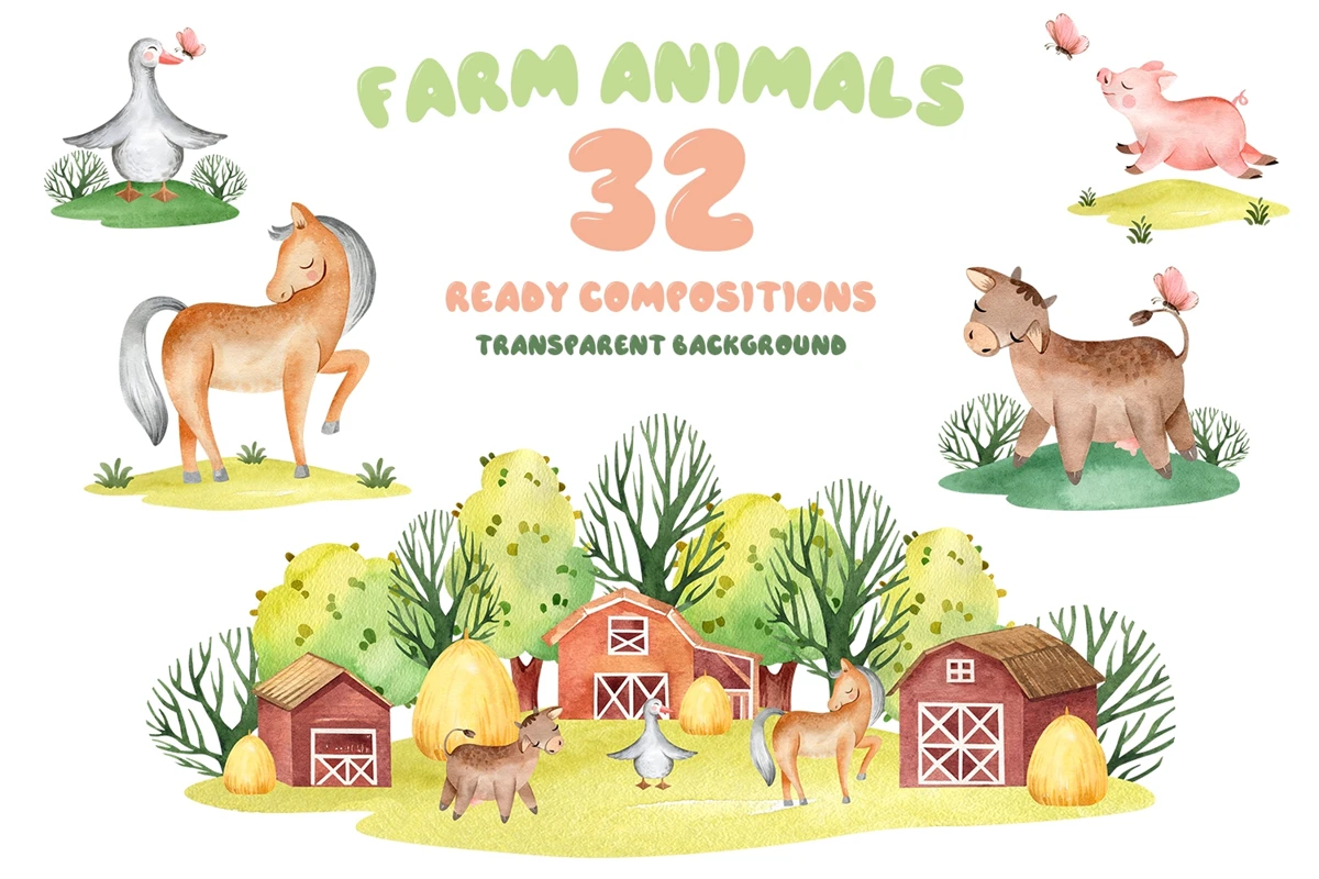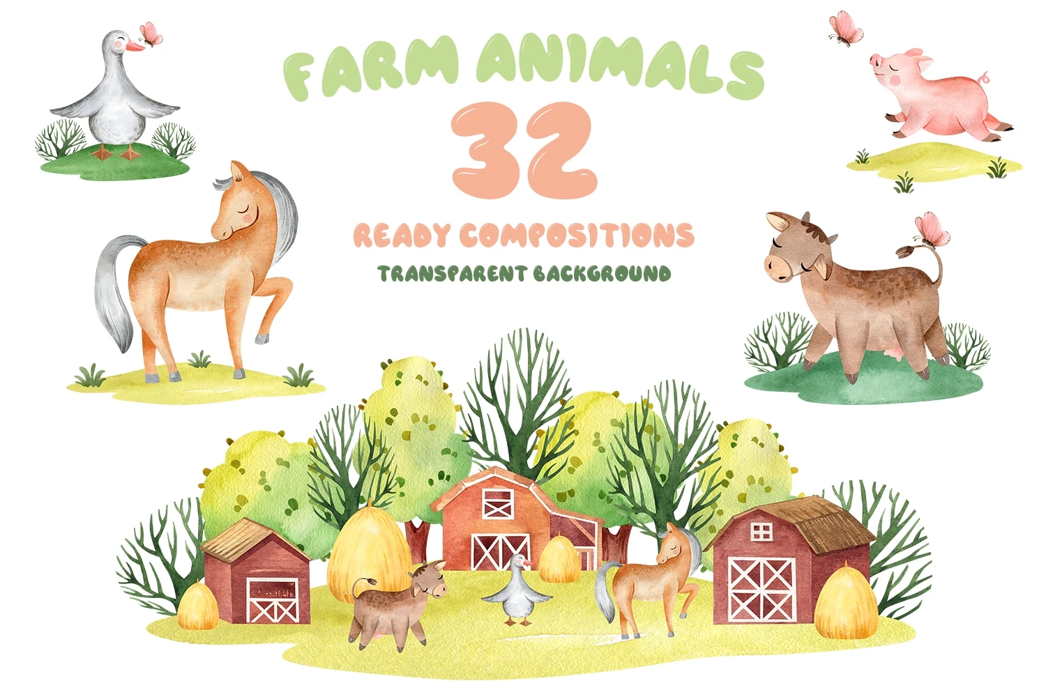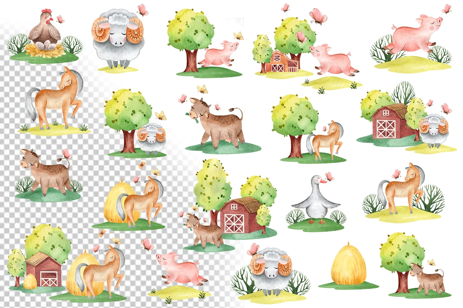 This is a high-quality set of ready-made watercolor animal compositions: cow, horse, pig, chicken, goose, sheep, farmhouses. Perfect design for kids crafts, greeting cards, apparel, blogs, posters, decor, sublimation and more.