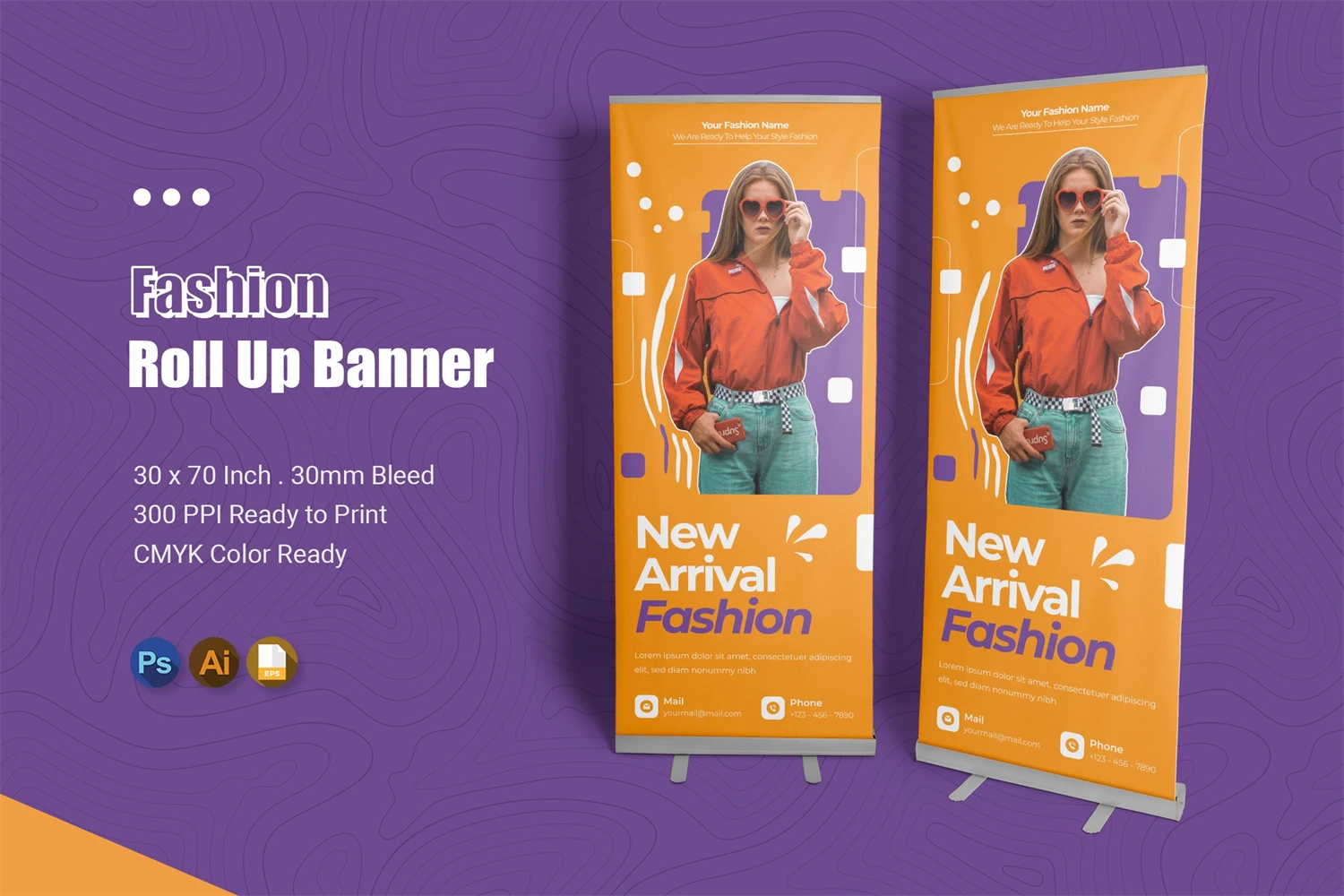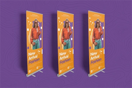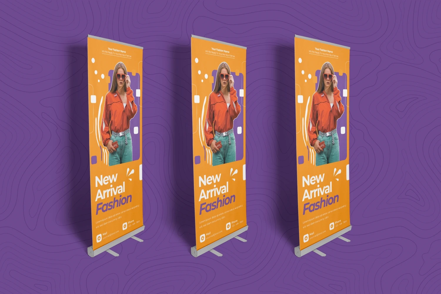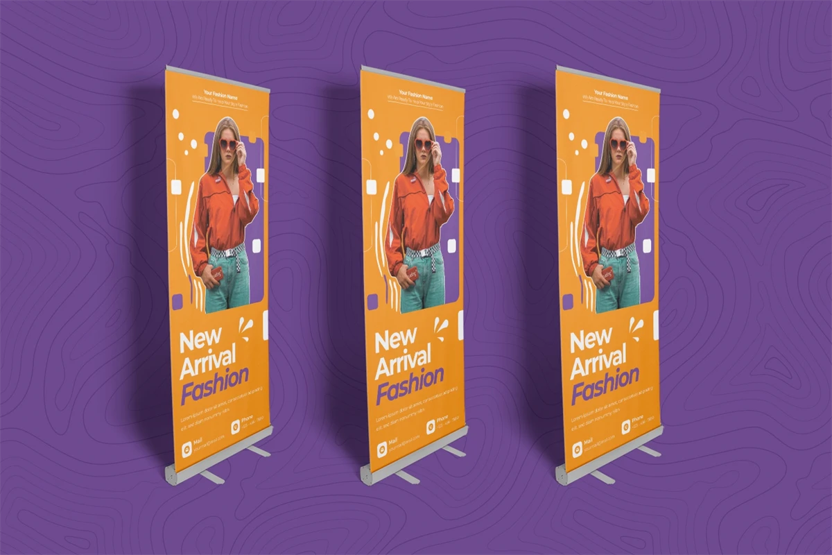 Our roll-up banner template tells your brand's story at a glance. This design stands out and can be used to showcase pictures and content effectively.