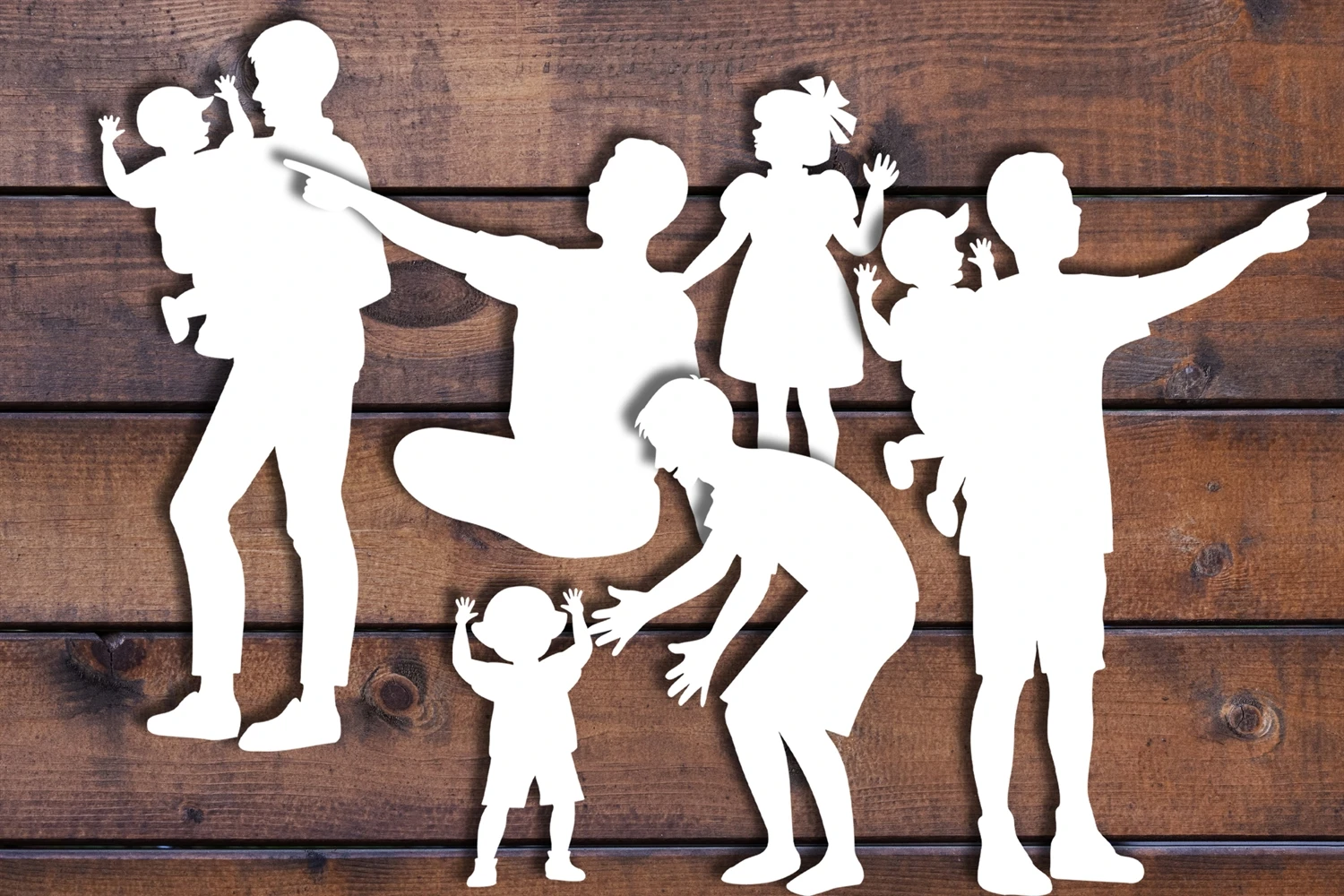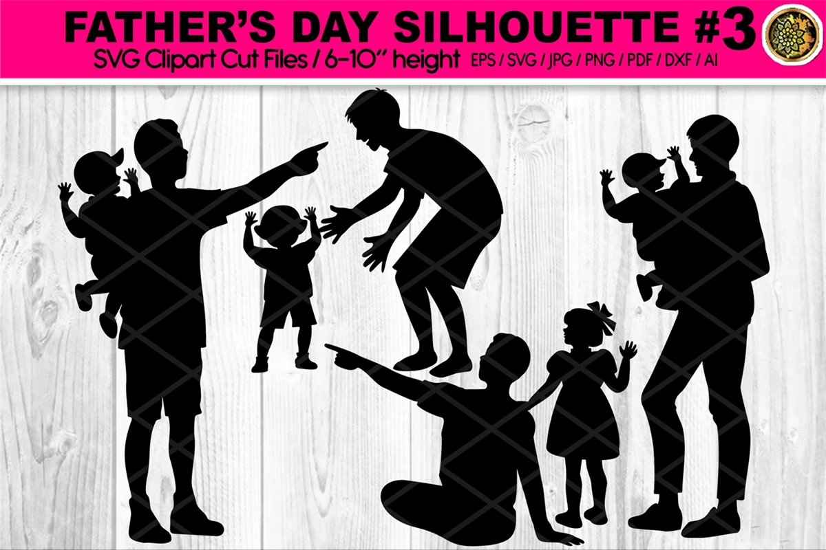 Set of Digital Download Father's Day Silhouette V-3 for your creative DIY projects. 4 designs of warm-hearted posting characters of Fathers and their children. Perfect for use as an element for Father's Day Gift Card, Wallart, vinyl, personalized T-shirts, apparel, cups, stickers, card stock, and other DIY projects. Options are endless!