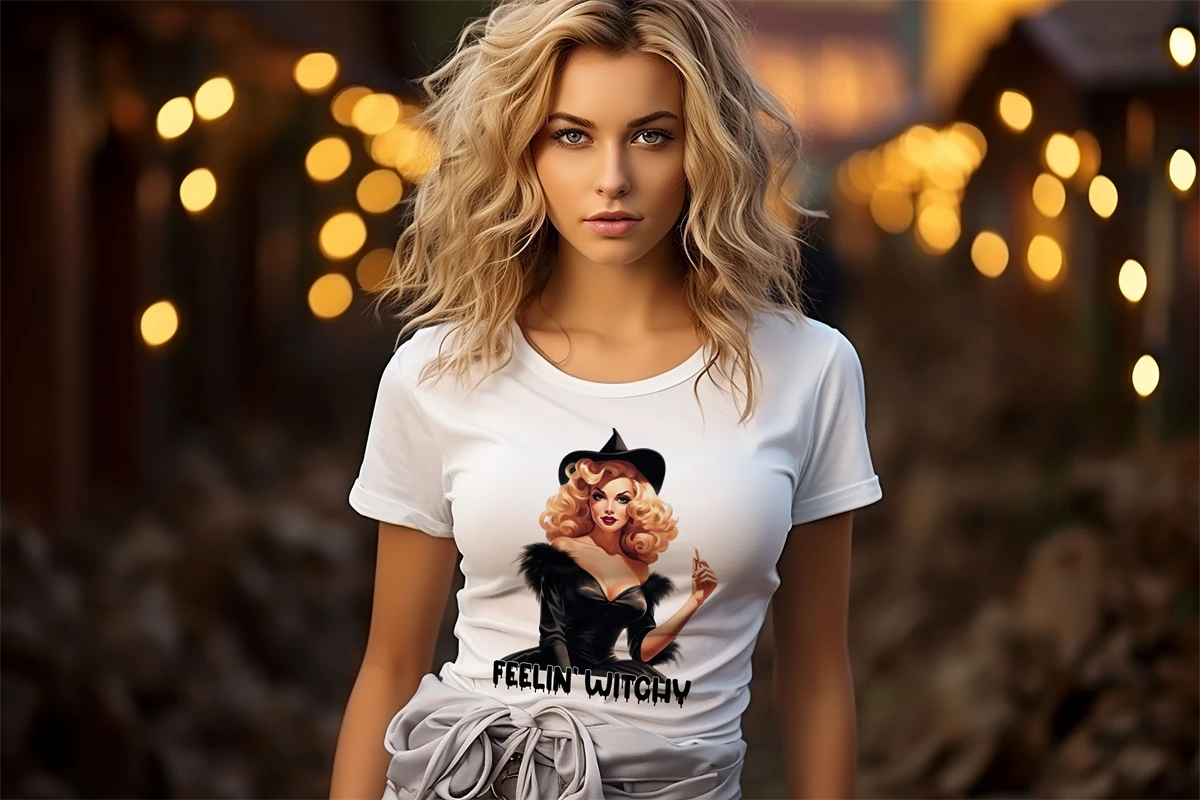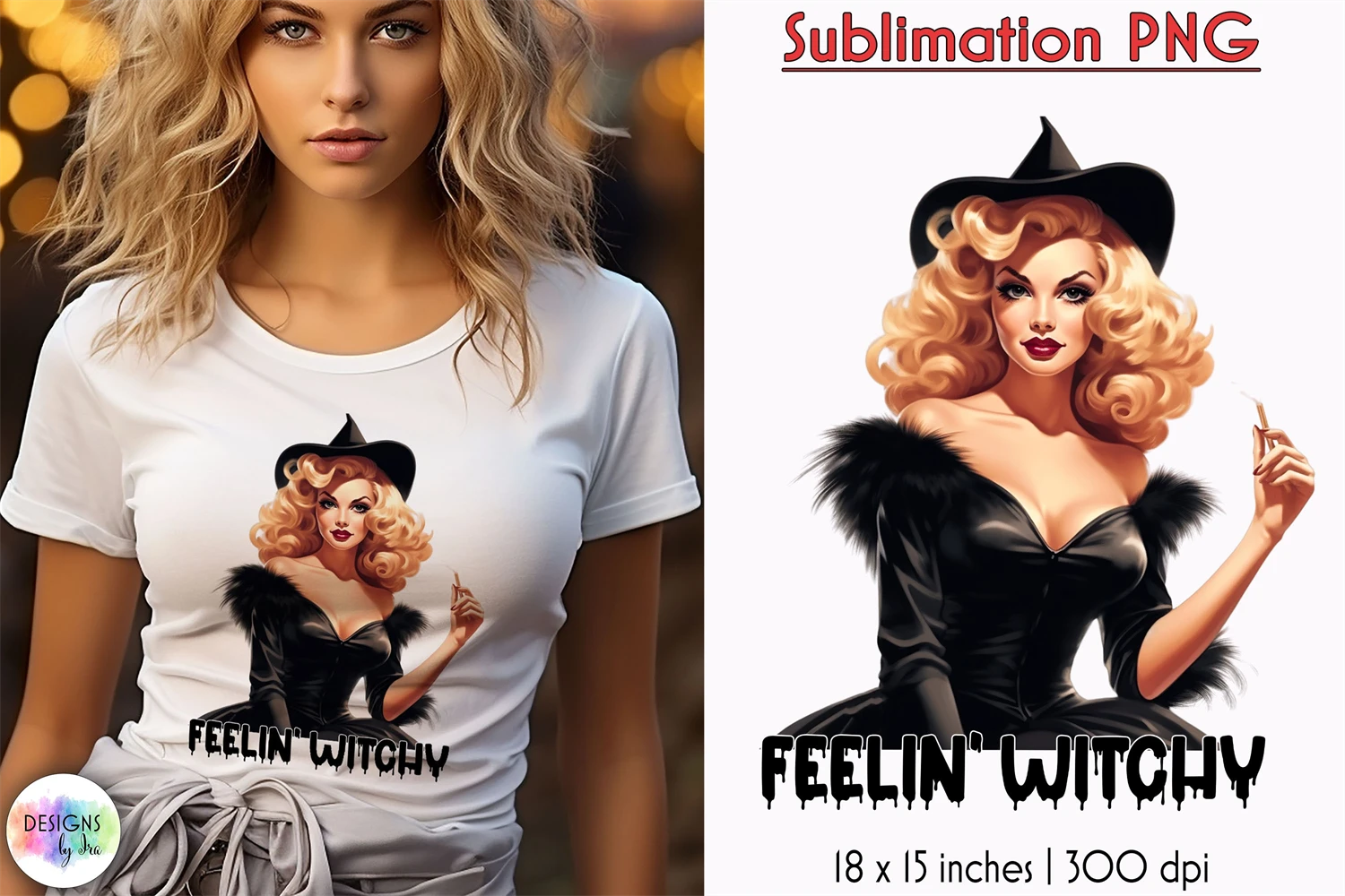 Halloween sublimation design with retro pin-up girl, dressed up in a witch robe.