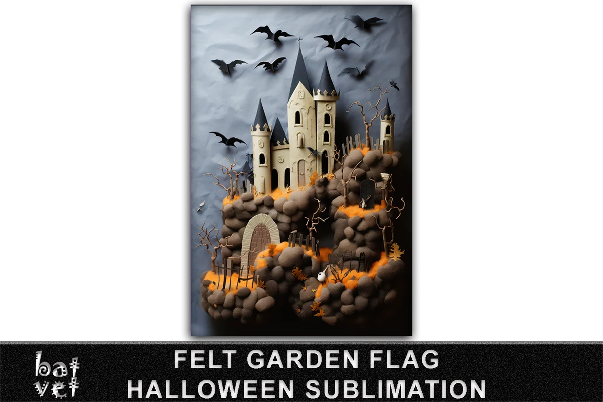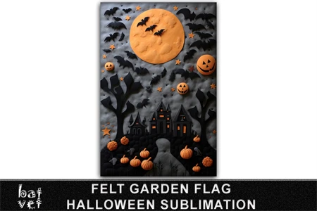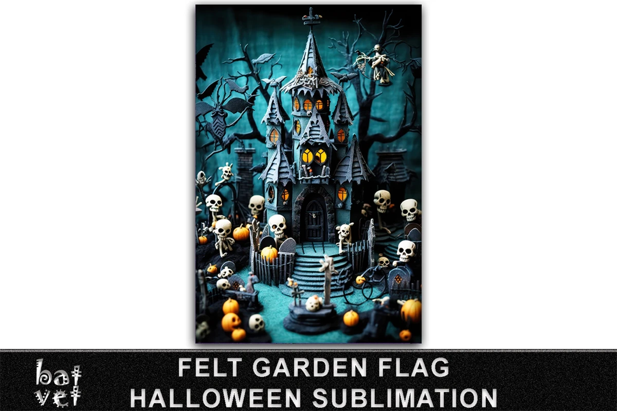 Halloween Garden Decor Felt Flag, Haunted Mansion, Castle, Full Moon, Carved Pumpkin, Skulls, Bats Sublimation Garden Flag Design.
