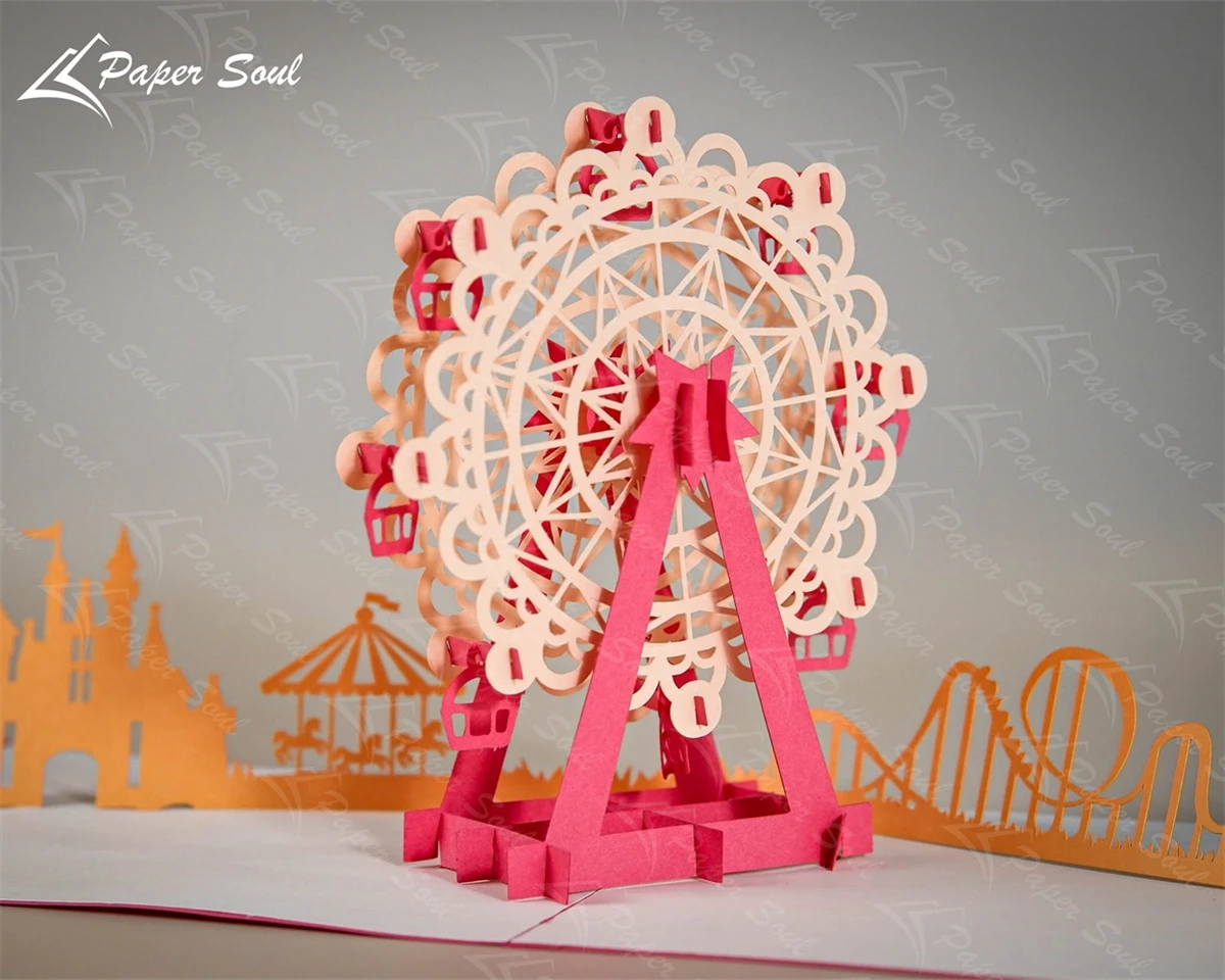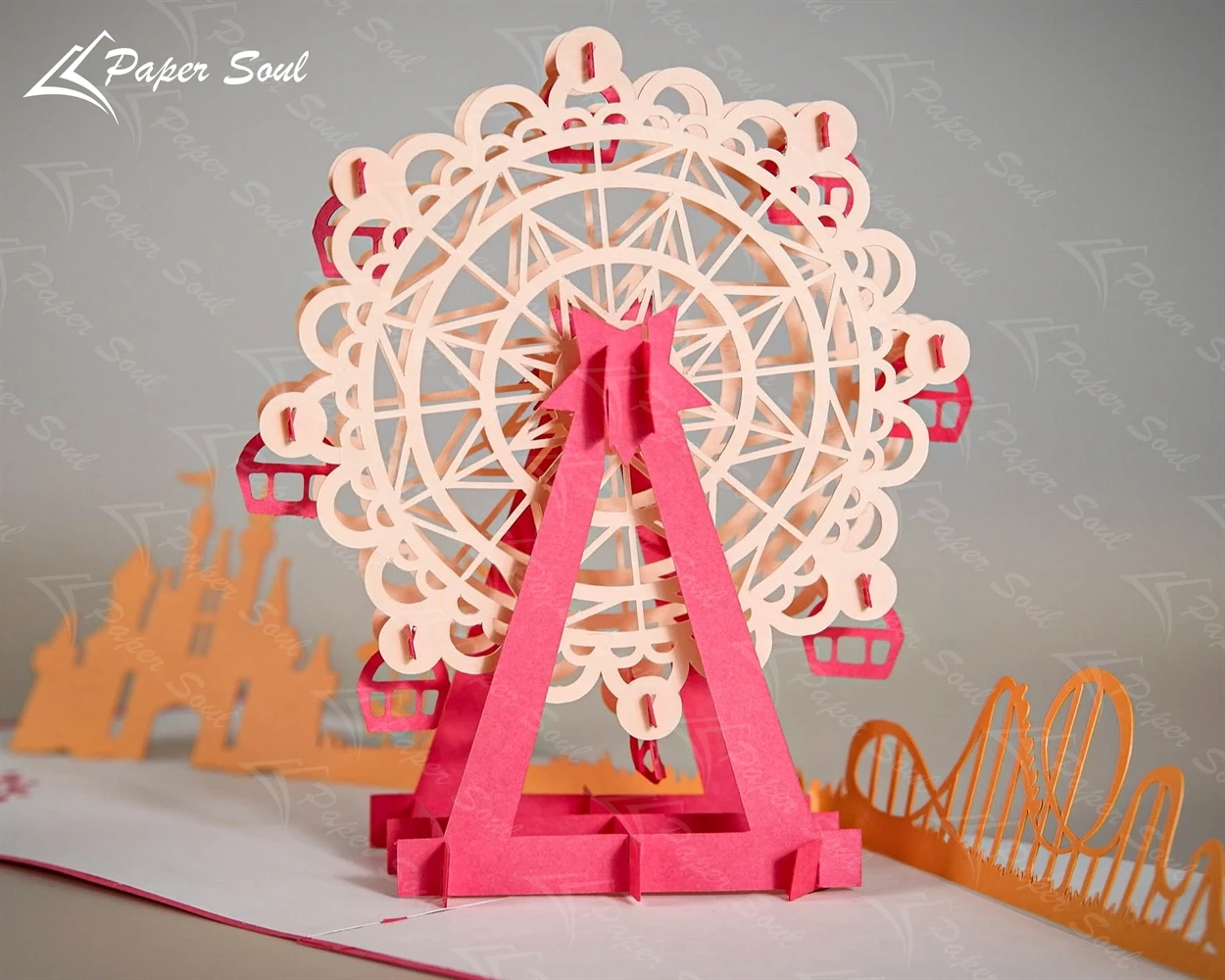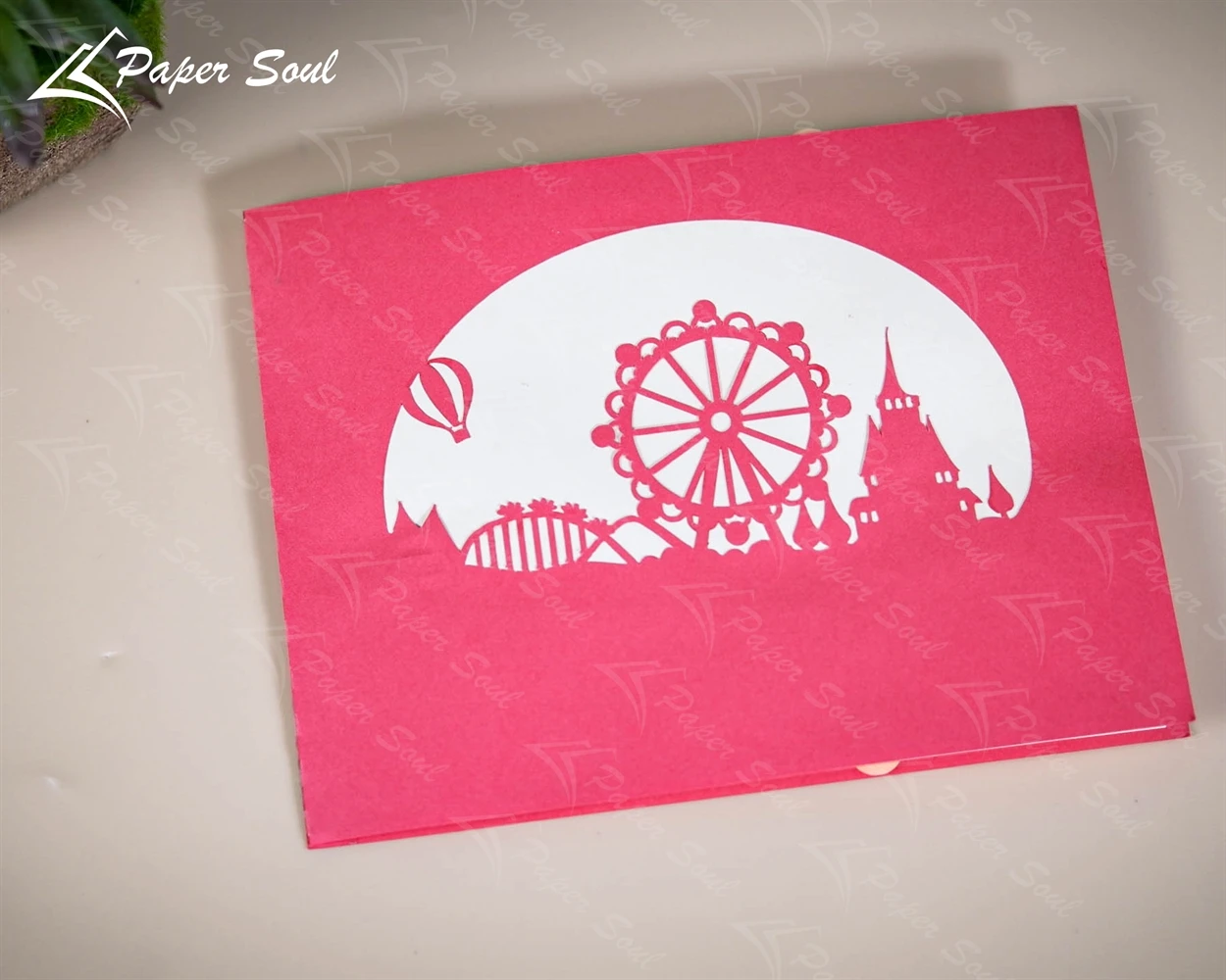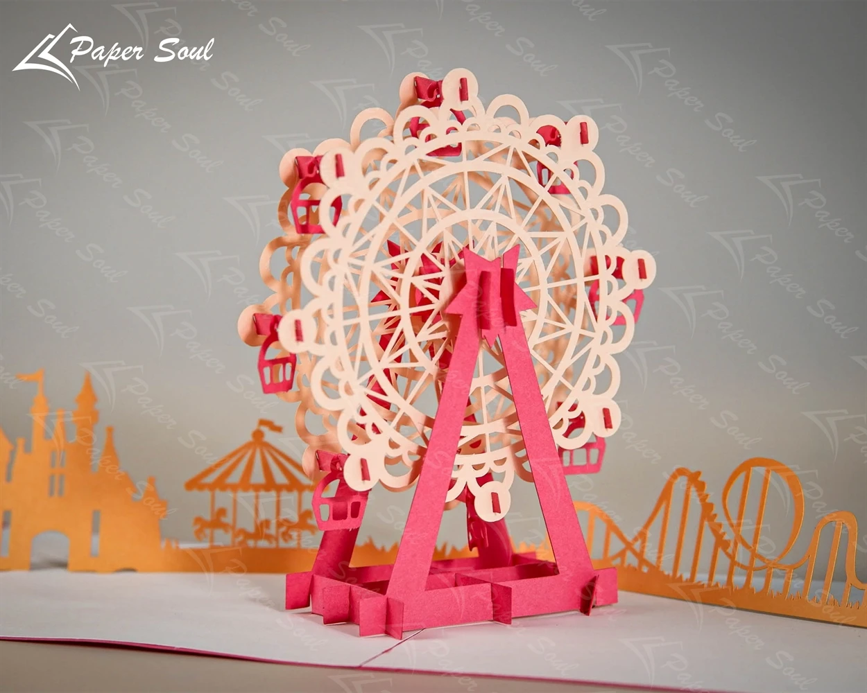 Make the wonderful pop-up card, featuring a Ferris Wheel, with this Ferris Wheel pop-up card template - in SVG, PNG, PDF format, ready to cut on your Cricut, Silhouette, or other cutting machines.