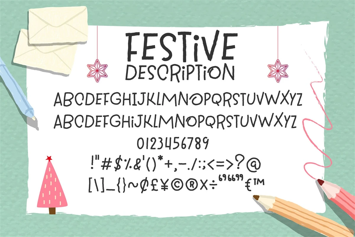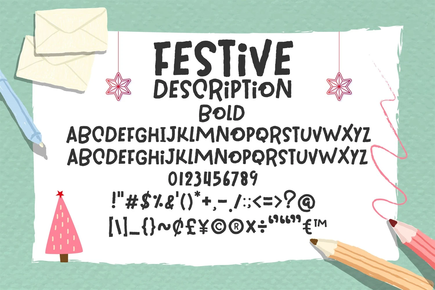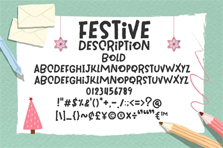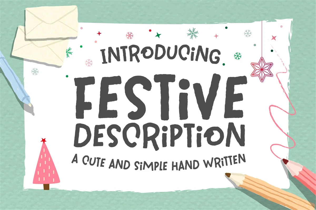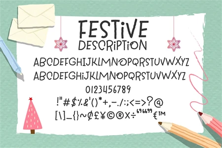 Festive Description Font is a charming and playful handwritten font perfect for adding a touch of authenticity to your designs. Whether you're creating chalkboard quotes, teaching materials, or any other project that needs a handwritten feel, this font is sure to delight. With its cute and simple letterforms, Festive Description brings a personal and realistic touch to your work. Get ready to infuse your designs with warmth and character with this delightful font.