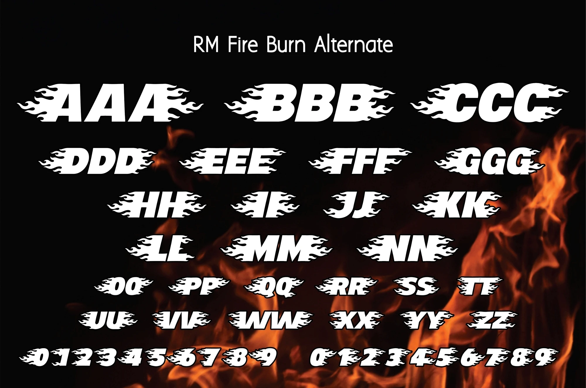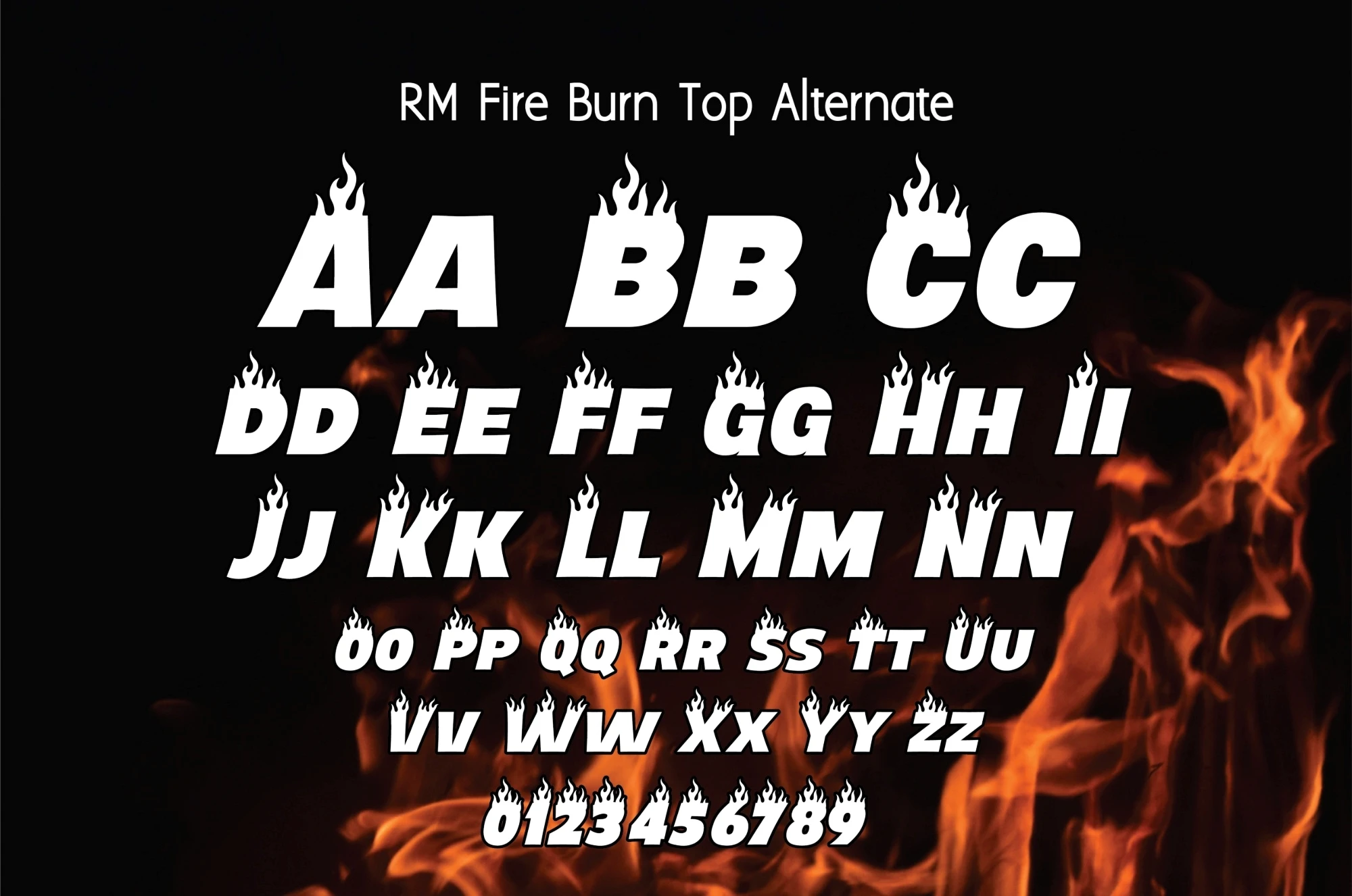 Presenting Fire Burn, a picturesque font that invites the mesmerizing flare of flames into your design repertoire. This font sets your creativity alight, exhibiting fiery effects that brilliantly alternate from front to back, and peak at the top. It's akin to holding an enchanting ember in your hands, so warm and alive, it could dance. The Fire Burn font instills your projects with an invigorating, evocative touch and simplicity of use that can unfetter your imagination, all the while giving your work an exclusive sizzle of bold intensity.