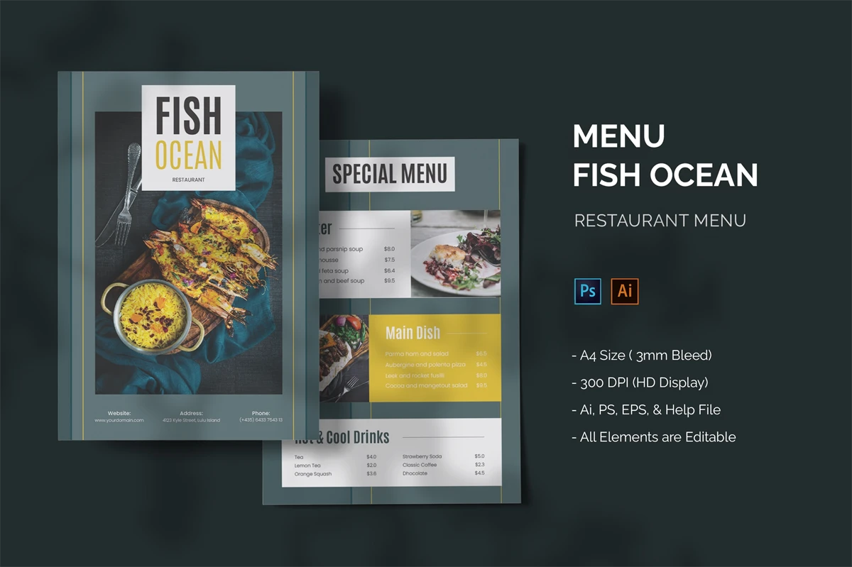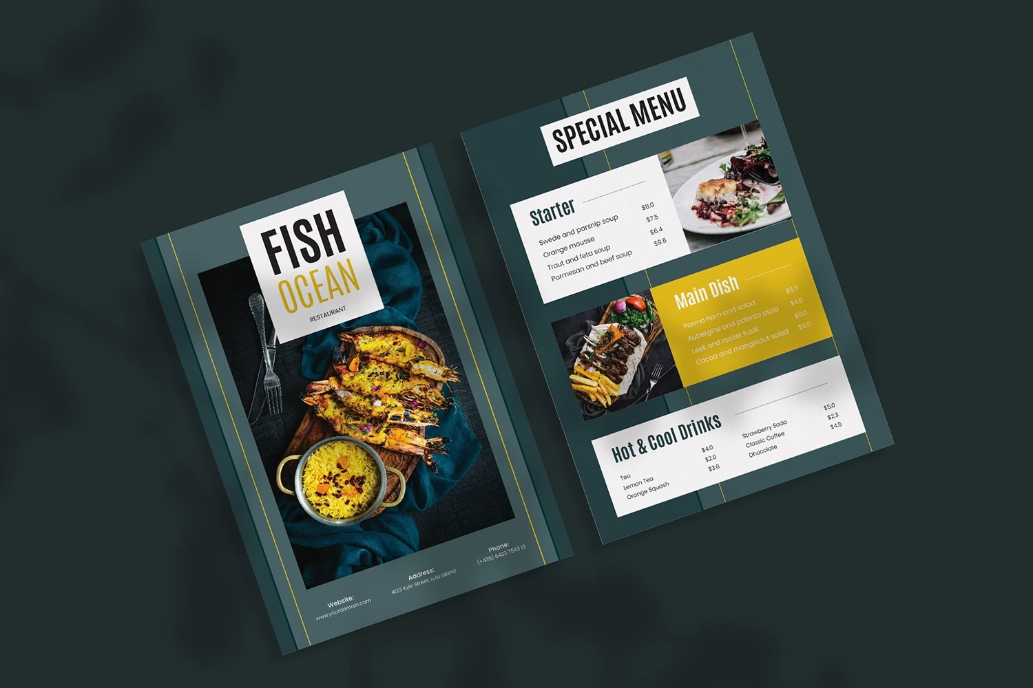 Fish Ocean - Restaurant Menu. This template is great for your business and will make your customers interested, elegant, and easily editable according to your needs, this restaurant menu is perfect for, promos, cafes, hotels, resort shops online. etc. I hope you enjoy this restaurant menu