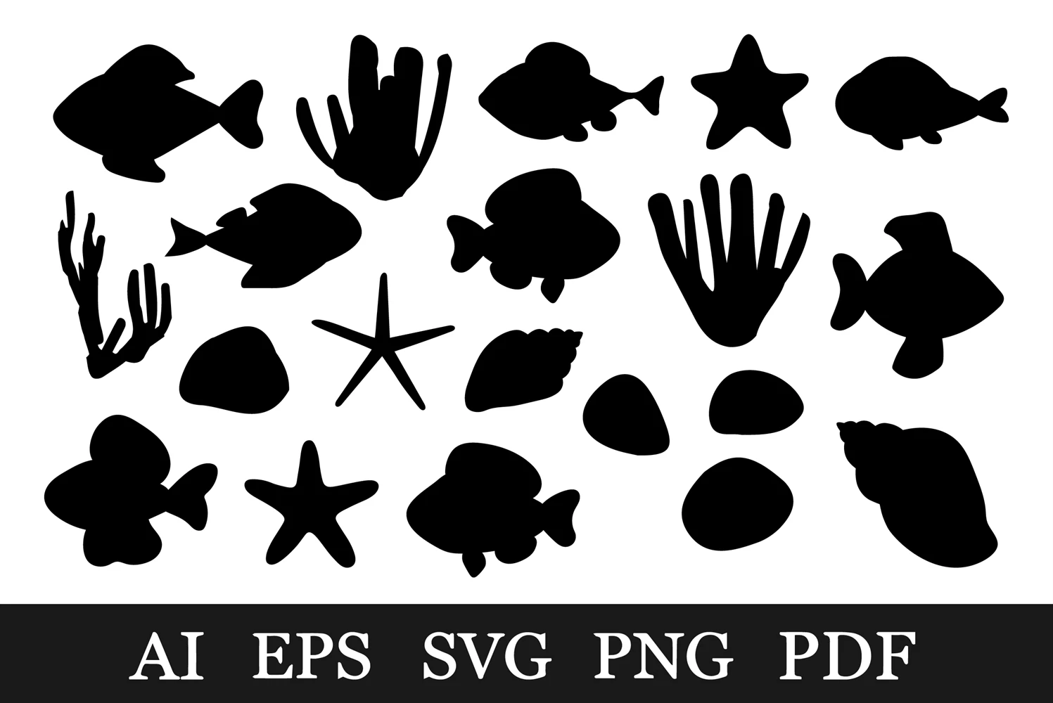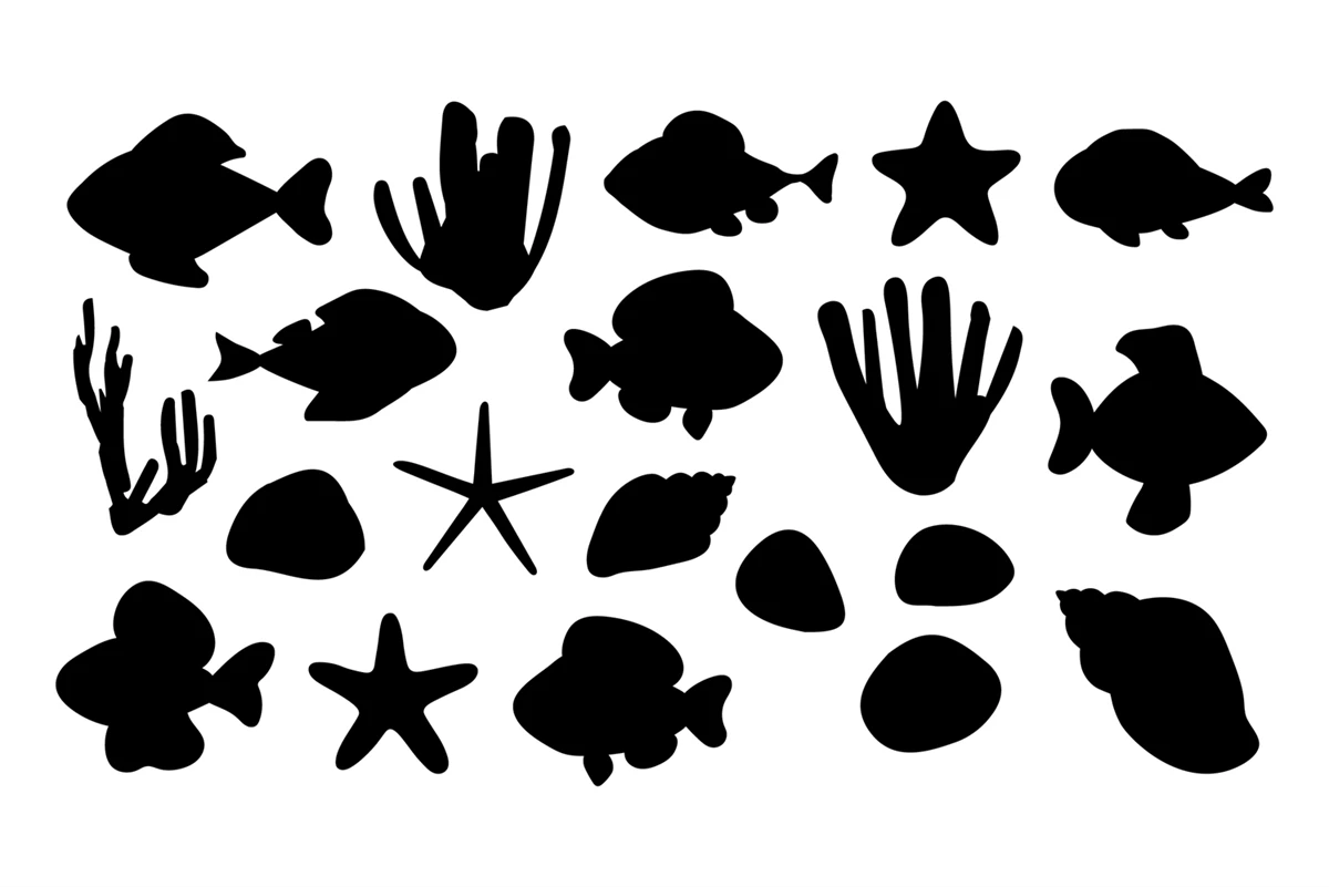 Fish silhouette. Starfish silhouette. Sea shell silhouette