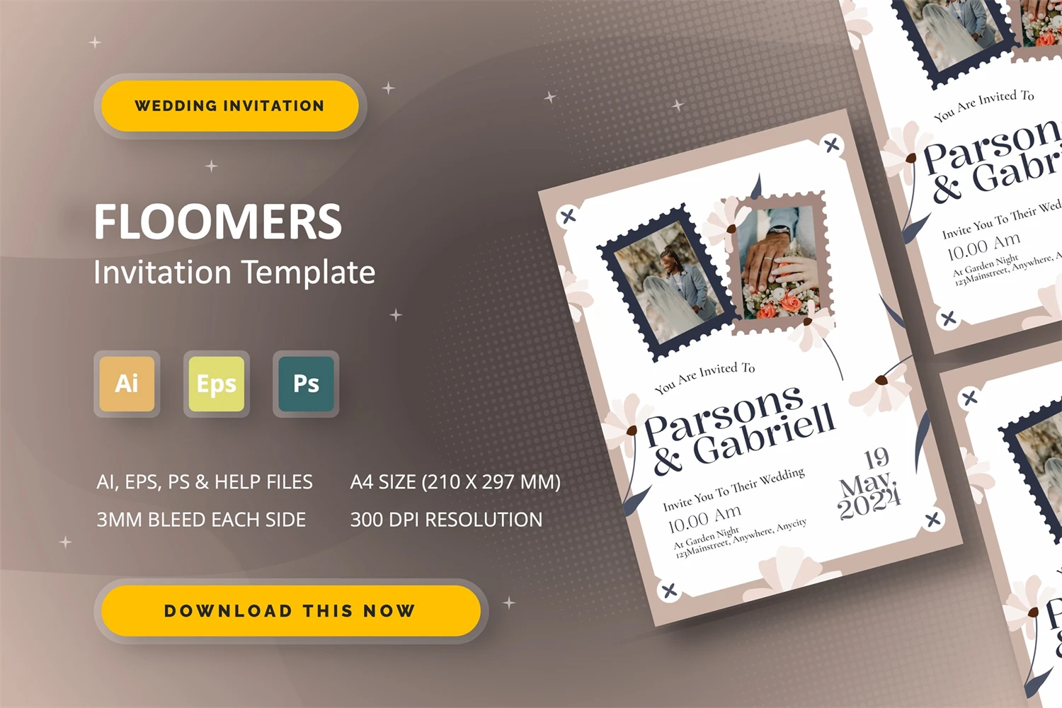 Introducing our clean and elegant graphic design wedding invitation template. Soft colors set a serene mood, while clear typography showcases your names. A touch of nature-inspired design adds charm, all wrapped up neatly. Customize with your details and share the joy with your guests!